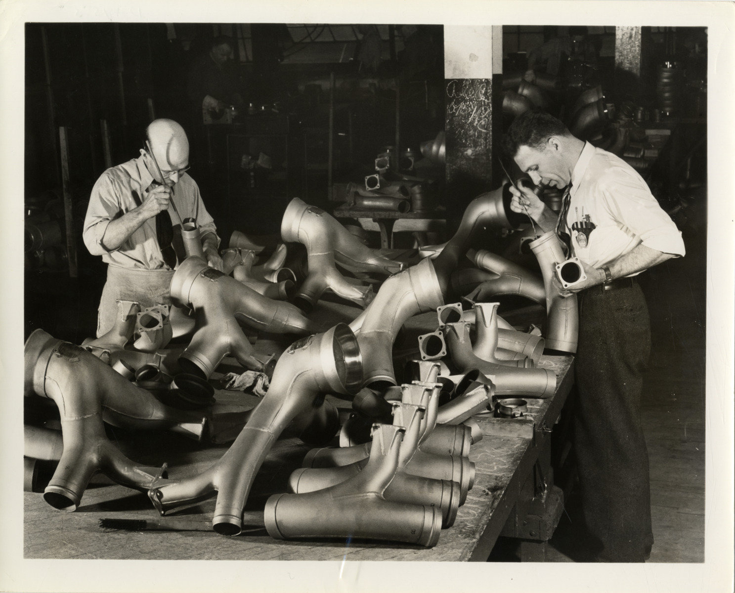 View of men inspecting exhaust manifolds for the B-17 Flying Fortress bomber aircraft, manufactured by Fisher Body. Label on back: "Inspecting exhaust manifolds built by Fisher Body for Flying Fortresses. These and other parts being built by Fisher body for the big bombers are being turned out in such quantities that for the first time in aviation history they are being shipped in freight car-load lots. From W.S. McLean, Fisher Body Division, General Motors Corporation, Detroit 2, Michigan. For immediate release. (Note editor: This caption and photo has been reviewed by the War Department)." Handwritten on back: "Aircraft--Bombers (Parts & assembly)."