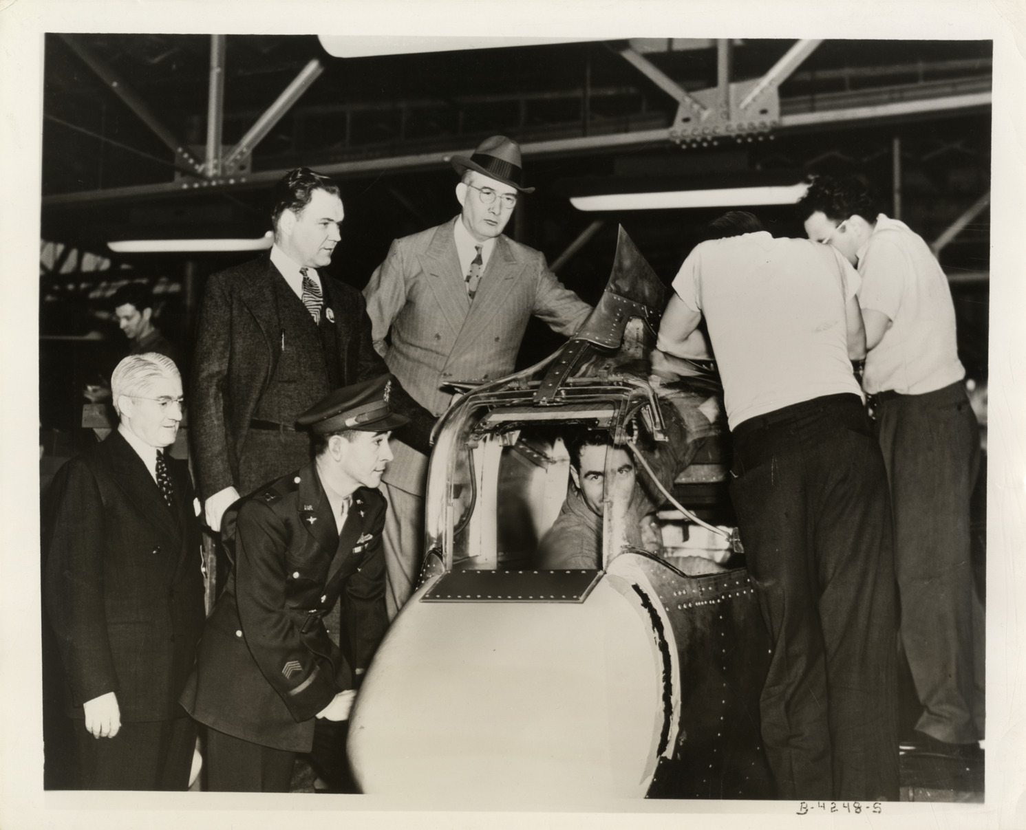 View of Glenn L. Martin and others on the assembly line with a rear fuselage section at the Hudson Motor Car Company's aircraft division. Label on back: "From autos to aircraft. Glenn L. Martin, pioneer plane designer and president of the Glenn L. Martin Co., Baltimore, is shown on the assembly line in the Hudson Motor Car Company's aircraft division, inspecting a partially completed rear fuselage section. Left to right, A.E. Barit, president of Hudson; J.W. Eskridge, superintendent of Hudson's aircraft division, and Mr. Martin. In the foreground is Capt. Walter R. Godard, resident representative of the Army Air Forces. They are standing on a platform beside one of the many specially constructed jigs in which the huge fuselage sections are being assembled." Handwritten on back: "Aircraft--Bombers (Parts & assembly)."
