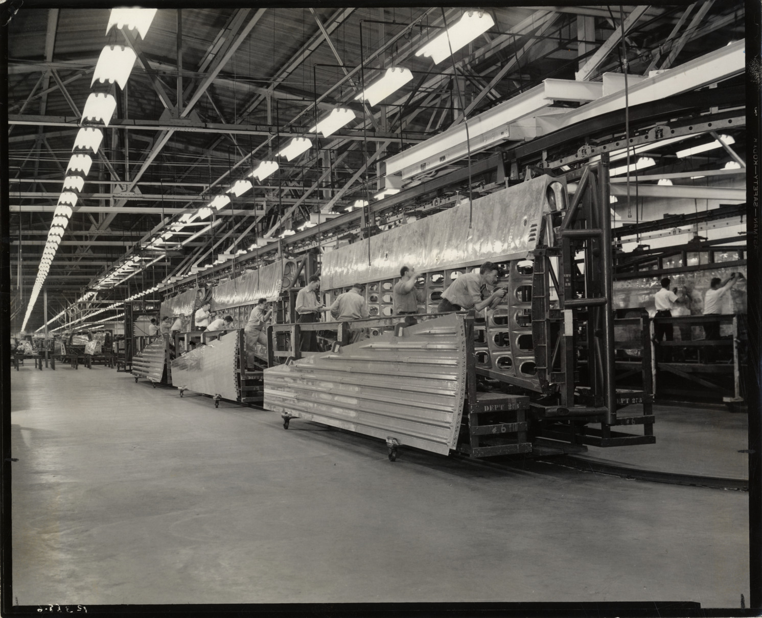 View of workers assembling wings for Boeing B-29 Superfortress bomber at the Murray-Scranton plant of the Murray Corporation of America. Label on back: "Print #P-388-6; the B-29 wing begins to form as the trailing edge is placed in a merry-go-round conveyor and the center section is assembled and attached to it in the Murray-Scranton plant. Murray Corporation of America made possible this type of mass production by directly adapting automotive methods to airplane assembly." Stamped on back: "Murray Corporation of America, 7700 Russell Street, Detroit, Michigan." Handwritten on back: "Aircraft--Bombers (Parts & assembly)."