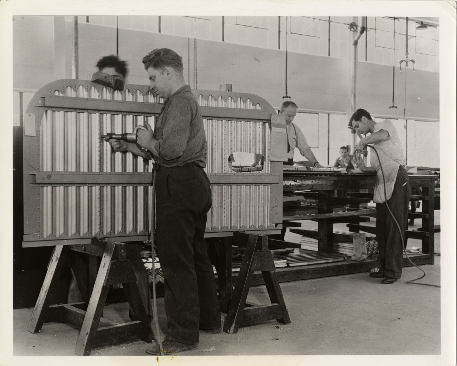 View of workers assembling gas tank doors for the Boeing B-17 Flying Fortress bomber at the Briggs Manufacturing Company in Detroit, Michigan. Label on back: "Some Boeing Flying Fortress gas tank doors, with more than 4,970 rivets and 100 major parts, being assembled at the Briggs Manufacturing Company's plant in Detroit, Michigan. Here for the first time in the automobile industry, important parts for American bombers are being turned out in volume. Other aircraft parts made now by Briggs include 70 different Boeing ducts, Douglas wings and Vought-Sikorsky wings. (206). Briggs Manufacturing Company, Detroit, Michigan." Handwritten on back: "Aircraft--Bombers (Parts & assembly)."