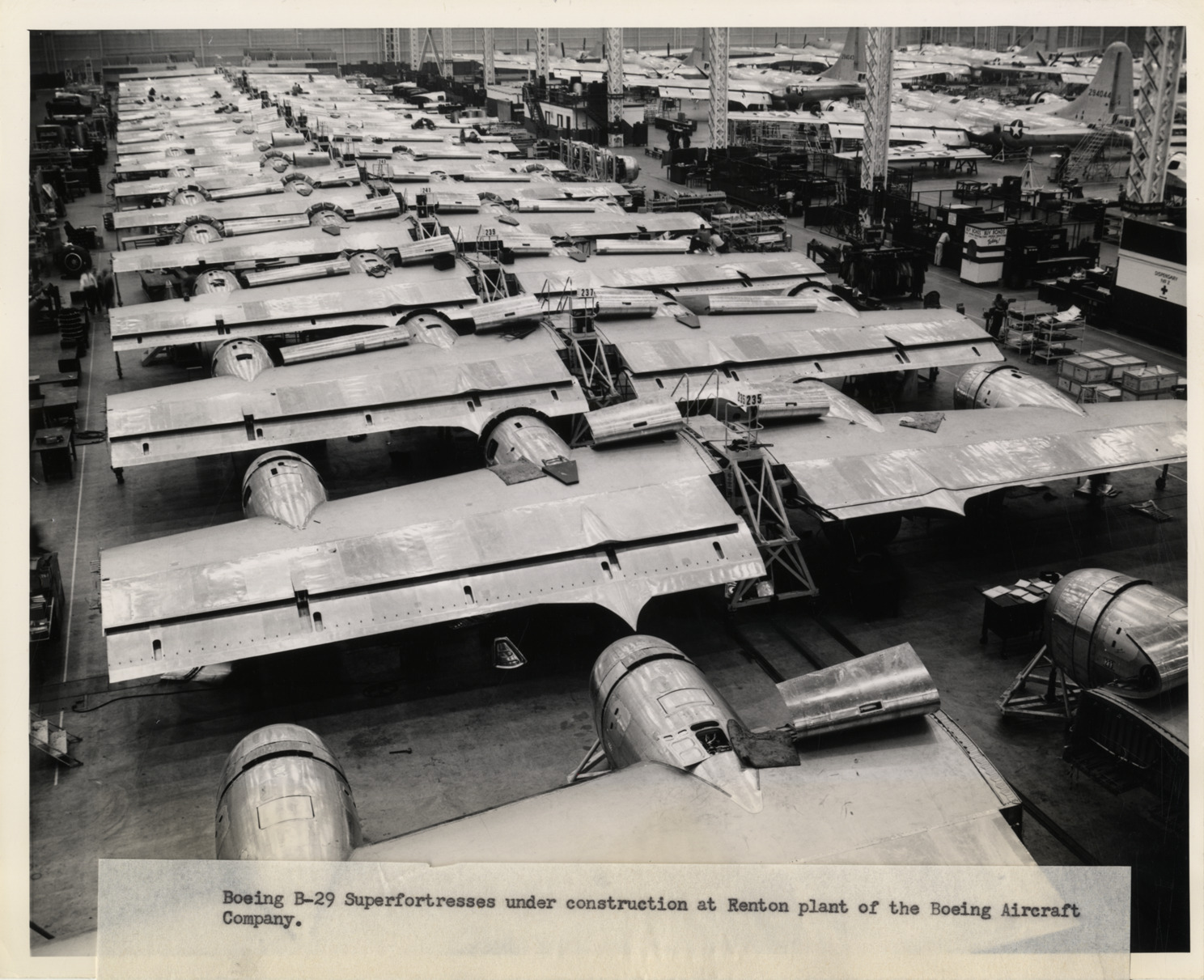 View of Boeing B-29 Superfortress bomber aircraft under construction at the Boeing Aircraft Company in Renton, Washington. Label on back: "Boeing B-29 Superfortresses under construction at Renton plant of the Boeing Aircraft Company." Stamped on back: "Courtesy of News Bureau, Boeing Aircraft Company, Seattle, Washington. Designers and builders of the B-29 Superfortress, B-17 Flying Fortress, Stratoliner, Clipper." Handwritten on back: "Aircraft--Bombers (Parts & assembly)."