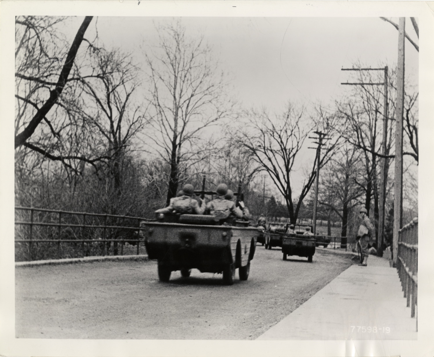 View of soldiers in Ford GPA amphibious vehicles. Label on back: "Most flexible new machine of the war, on land or in the water, the new quarter-ton four-wheel drive amphibian car built by the Ford Motor Company is shown being put through various tests in the Detroit area. With a capacity of five men, the new machine can plunge into the water and propel itself as a boat. No steering gear changeover is required from land to water operation. From Ford News Bureau, John W. Thompson, Director. Administration Building. Dearborn, Michigan. Release, Sunday, March 21, 1943." Handwritten on back: "Amphibious vehicles."