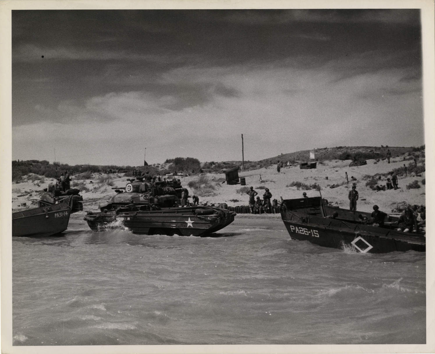 View of U.S. Coast Guard landing barges and amphibious trucks on the coast of Sicily during World War II. Soldiers on shore. Typed on back: "From: Public Relations Officer, U.S. Coast Guard, Washington, D.C. Backing up the infantry. U.S. Coast Guard-manned landing barges and heavily loaded amphibious trucks rush supplies to a Sicilian shore for the infantry advancing beyond the ridges." Handwritten on back: "Amphibious vehicles."