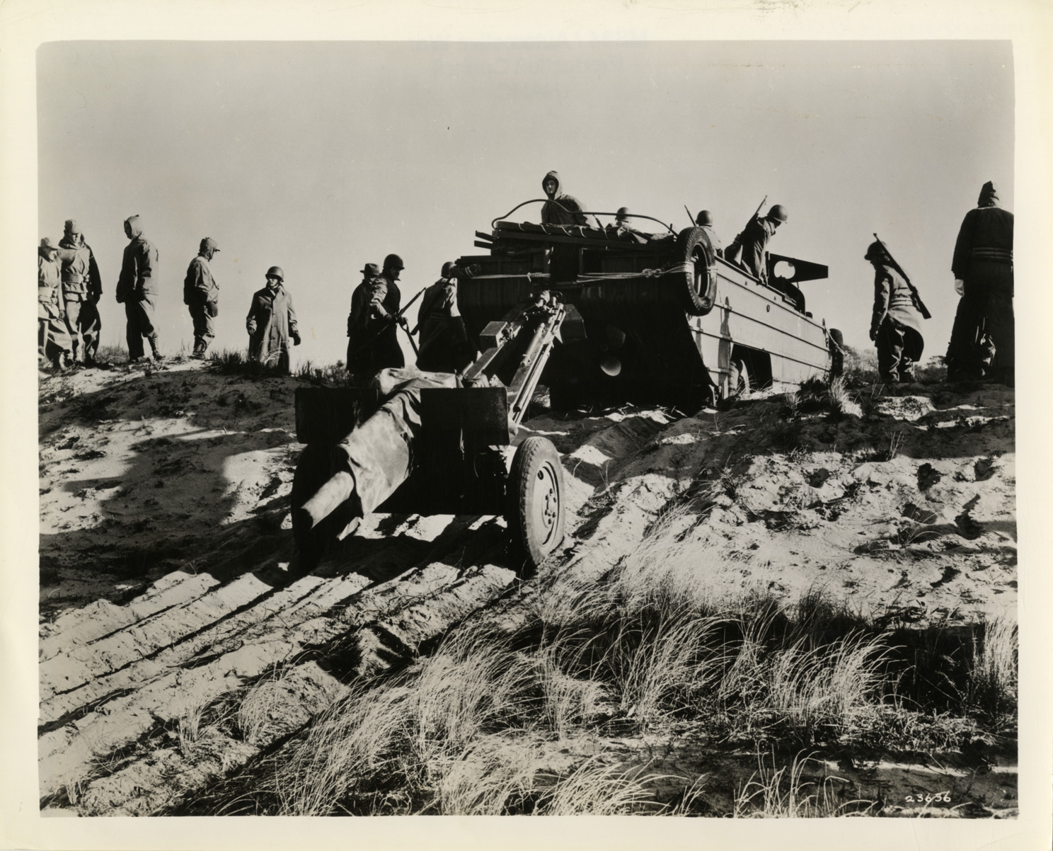 View of soldiers with GMC amphibious truck (DUKW) towing howitzer. Label on back: "Water is no barrier to the progress of this newest adaptation of the 2-1/2-ton basic six-wheel drive Army truck. Called 'Duck' it is now in volume production at General Motors Truck and Coach factories. It will ride the waves or buck the surf with an ease that is astonishing, and over the roughest terrain, it will do anything that an all-wheel drive truck can be expected to do. Here, it is shown towing a 105 mm. howitzer. (Approved by the War Department, Bureau of Public Relations.)" Handwritten on back: "Amphibious vehicles."