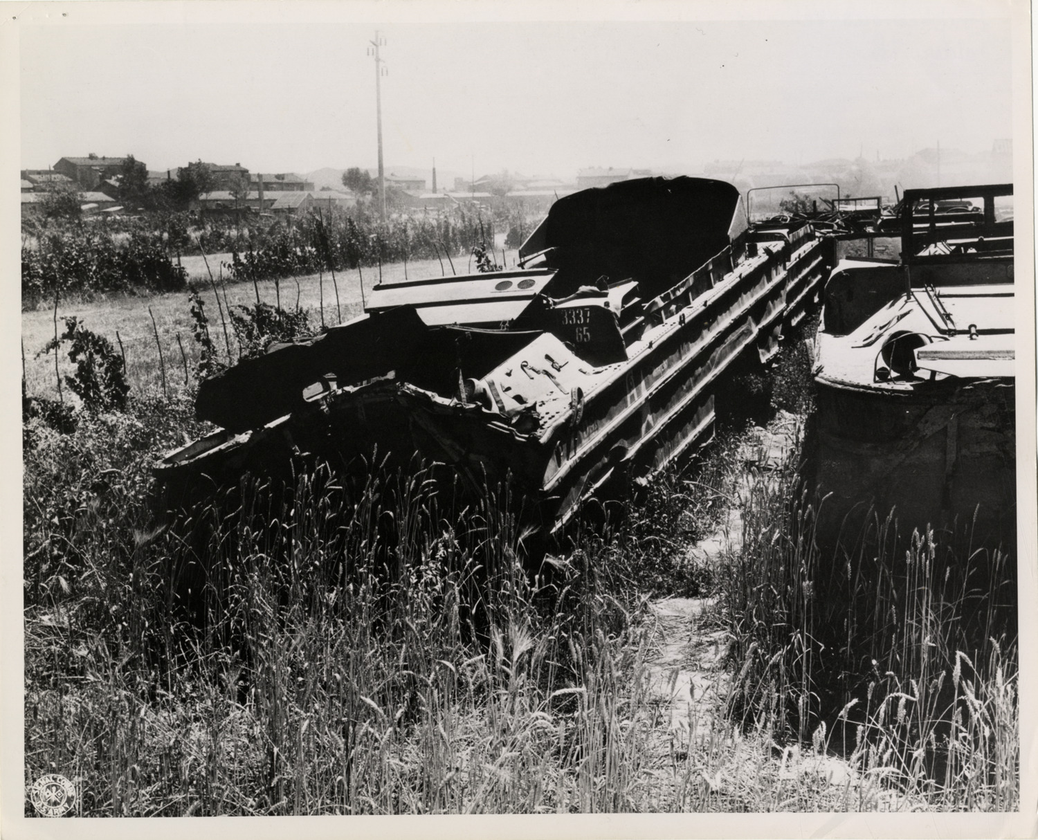 View of amphibious truck in salvage yard in Livorno, Italy during World War II. Label on back: "Leghorn, Italy. Redeployment: Ord. Tank & Veh. Park. 2-1/2 ton duck at peninsular base section ord. salvage point, beyond repair for redeployment." Stamped on back: "Signal Corps photo, please credit. Released by authority of the Bureau of Public Relations or by Theatre Press Censor." Handwritten on back: "Amphibious vehicles."