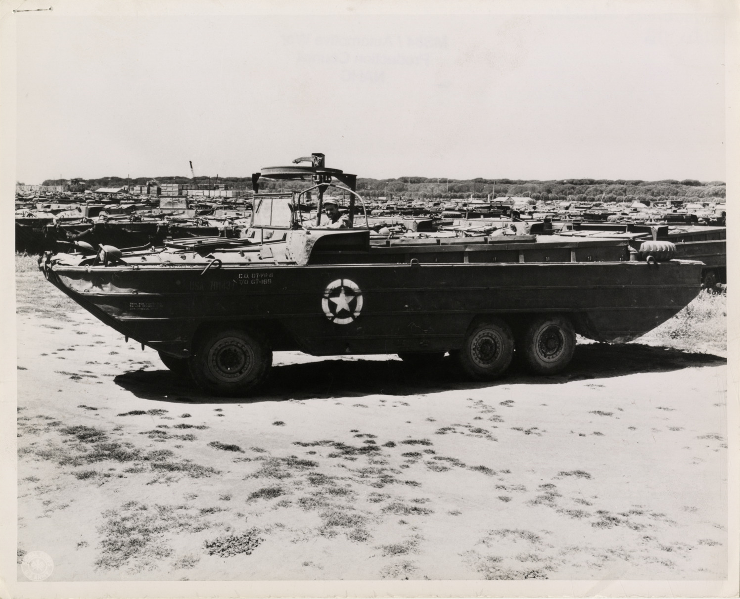 View of Sgt. Joseph Bernhart in amphibious truck at salvage yard in Livorno, Italy during World War II. Label on back: "Leghorn, Italy. Sgt. Joseph Bernhart, Bronx, New York, in 2-1/2 ton duck, one of many turned in for redeployment to Ord. Tank & Veh. Park, Peninsular Base Section." Stamped on back: "Signal Corps photo, please credit. Released by authority of the Bureau of Public Relations or by Theatre Press Censor." Handwritten on back: "Amphibious vehicles."