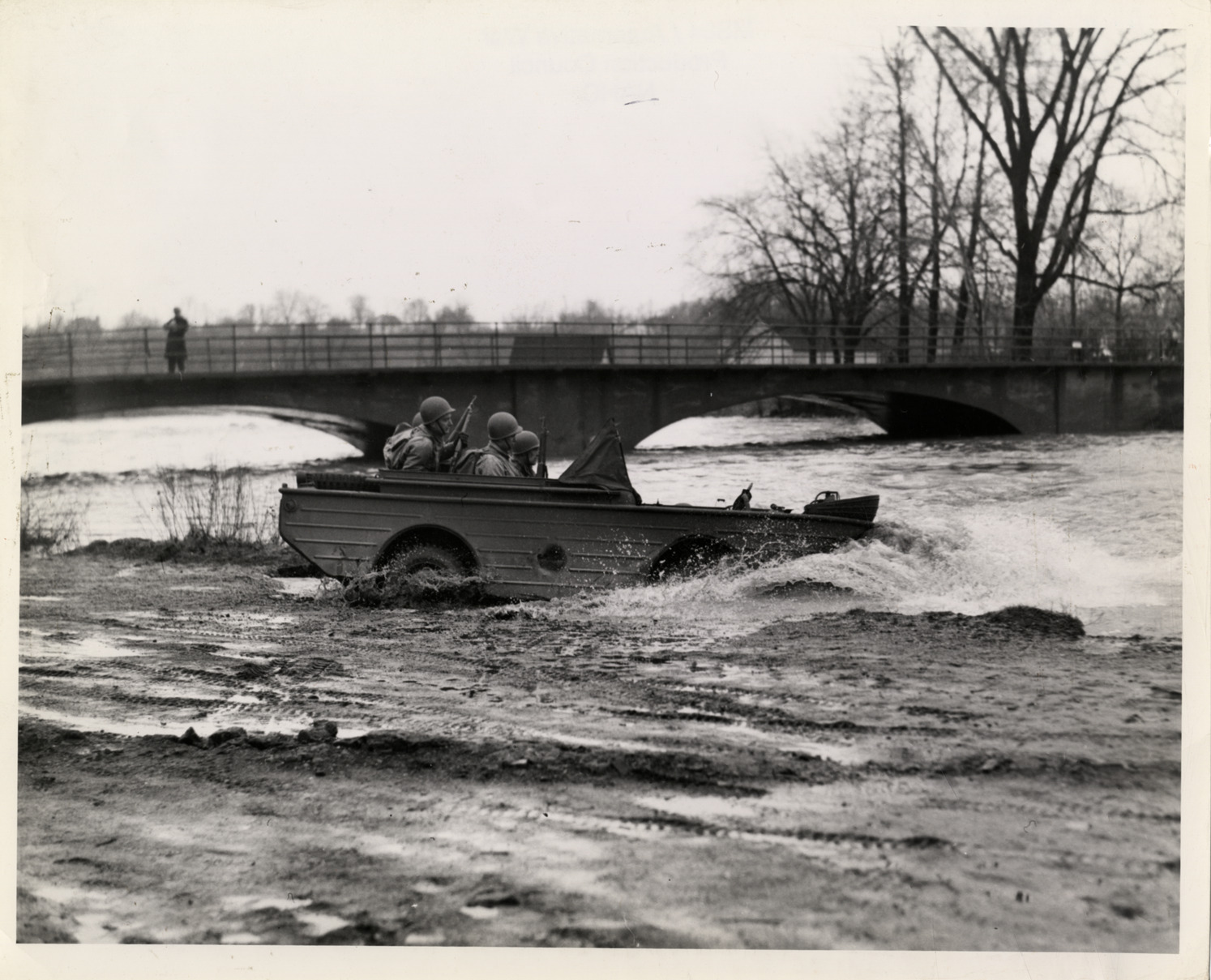View of soldiers in Ford GPA amphibious vehicle during maneuvers near Detroit. Label on back: "Release Sunday, March 21, 1943. The Army's most flexible new machine of the war, a Ford-built amphibian reconnaissance car, carrying soldiers equipped for combat duty, takes to the water in special tests staged recently in the Detroit area. These are the first pictures released showing how the new transportation arm of the Army appears in combat, taking off from land into a fast-flowing stream and propelling itself as a boat to the opposite shore. The boat steers in the water the same as on land. From Ford News Bureau, John W. Thompson, Director. Administration Building. Dearborn, Michigan." Handwritten on back: "Amphibious vehicles."