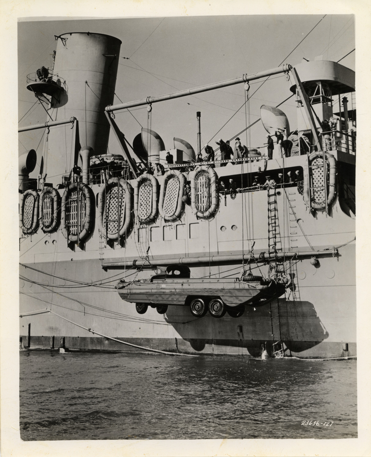 View of GMC amphibious truck (DUKW). Label on back: "By means of a power-driven winch, the amphibian truck can pull itself out of soft, sticky mud with astonishing ease. The winch cable is simply attached to a post, tree or any solid object on shore and the engine-driven winch does the rest. Unbelievable is the term used by engineers in describing the many accomplishments of this unique sea-going truck now being built by General Motors Truck and Coach. (Approved by the War Department, Bureau of Public Relations.)" Handwritten on back: "Amphibious vehicles."