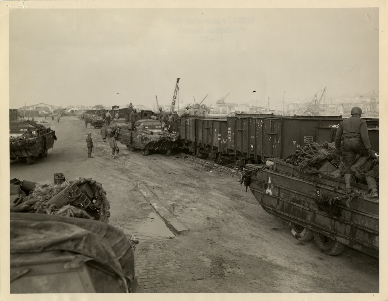 View of soldiers loading cargo into freight cars from amphibious vehicles at Le Havre, France during World War II. Label on back: "Supplies for the fighting front ashore in record time and loaded directly into freight cars to be hauled to the front by the Transportation Corps' Military Railway Service! Cargo is unloaded by means of the Ducks 'A' frame." Typed on back: "ETO HQ 44 20411 15 Nov. Credit, U.S. Army Signal Corps. Photog., Pvt. Seaborne 3120, Channel B.S. U.S. Army 'Ducks' which operate from ship to shore carrying cargo from Liberty ships, are shown here unloading their cargo directly into railway cars, at Le Harve [sic], France. 470th and 819th Amph Truck Co., Quai Joannes Couvert, Le Harve [sic], France." Handwritten on back: "Amphibious vehicles."