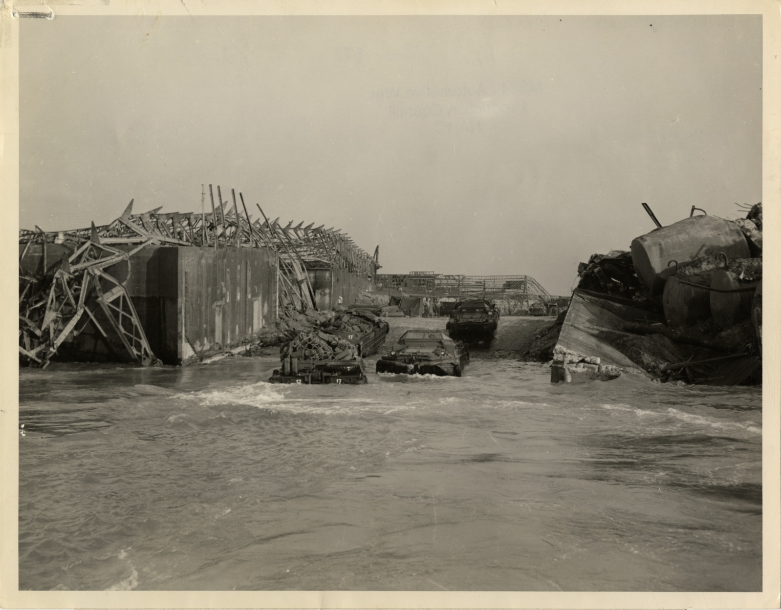View of amphibious vehicles near dock at Le Havre, France during World War II. Label on back: "Just a few days after the great French port of Le Havre fell to the Allies on September 12, the Army's famed, ingenious 'Ducks' leave the dock area to meet incoming ships and discharge their cargo. As much at home in the water as on land, these amphibian trucks have earned a distinguished record both in the Pacific and in Europe." Typed on back: "ETO HQ 44 20406 15 Nov. Credit, U.S. Army Signal Corps. Photog., Pvt. Seaborne 3120, Channel B.S. U.S. Army 'Ducks' go down ramp built through wreckage of dock warehouses at Le Havre, France. These Ducks go back and forth to the Liberty ships in the Harbor unloading gasoline. Bassin Darse Nord, Le Harve [sic], France, 470th and 819th Amph. Truck Co." Handwritten on back: "Amphibious vehicles."