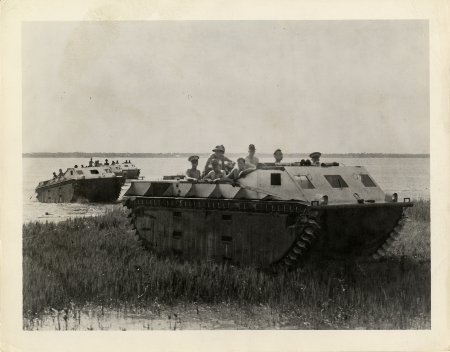 View of U.S. Marines posing in amphibious alligator tank on shore, with other alligator tanks in background. Label on back: "Crossing terrain such as is shown in this picture, in the old days would have meant engineers bridging river and swamp with pontoon construction, often under fire. But this sort of crossing is 'duck soup' to the United States Marines with their 'alligator tanks,' officially known as amphibians. Down one beach, across the river, up another beach, no matter how swampy, the steel alligators roar, with a hail-storm of cannon fire and machine-gun bullets pouring out of the port-holes in their steel-armored turrent [sic] to mow down enemy opposition. Attacks like this, coupled with the United States Marines landing boats parachute troops carried in transport planes an gliders, make a leatherneck landing party something for Uncle Sam's enemies to worry about." Stamped on back: "Official photograph. Please credit U.S. Marine Corps." Handwritten on back: "Amphibious vehicles."