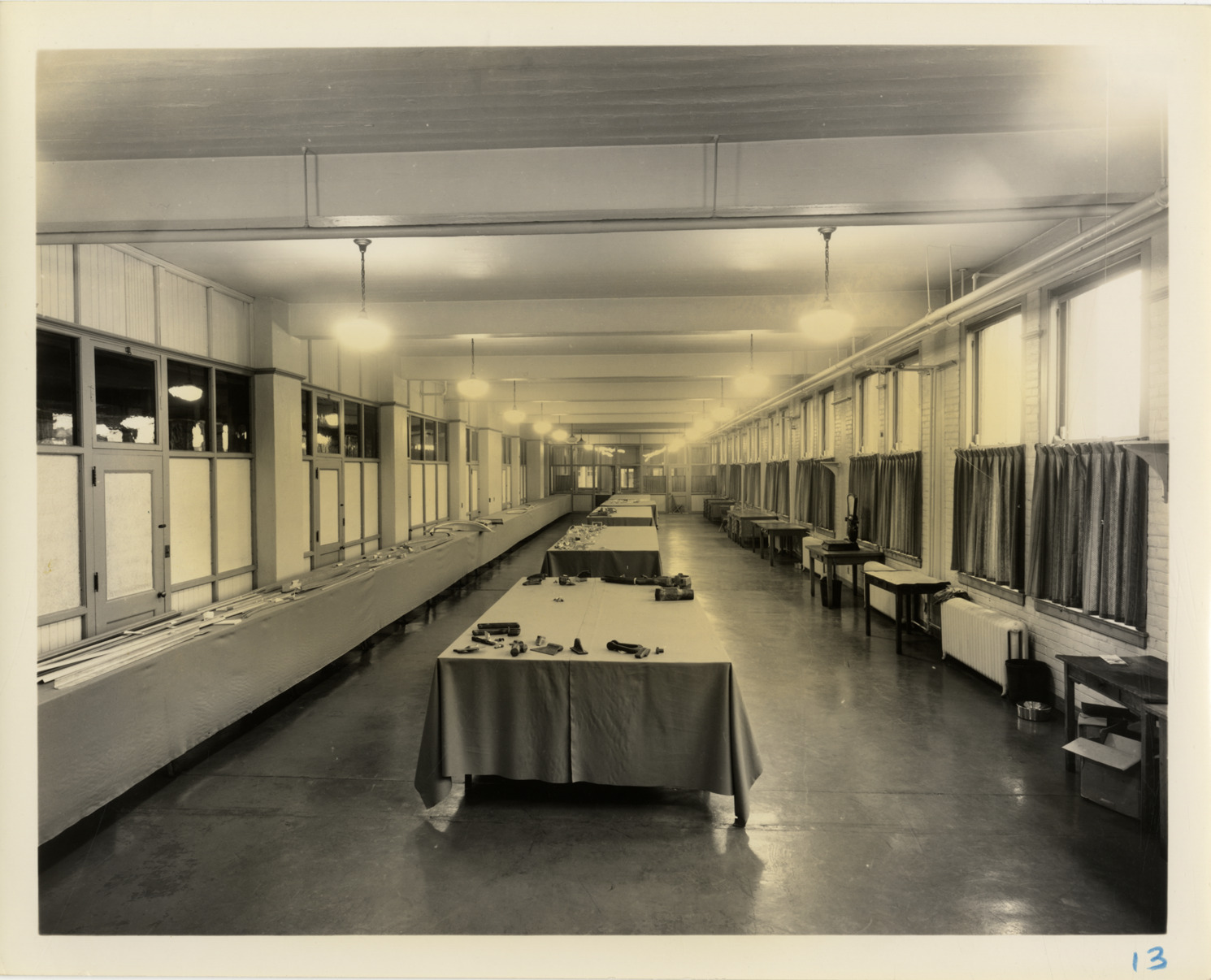 View of parts for the B-24 bomber, manufactured by Consolidated Aircraft Company, on display in room next to lobby in the headquarters of the Automotive Committee for Air Defense, located at 8505 West Warren Avenue in Detroit, Michigan. Tables are set up in center of room and along windows. Label on back: "13. View of long display room to the right of the lobby, containing a display of Consolidated B-24 castings, forgings, extrusions and rolled sections. (12/22/40)." Handwritten on back: "Automotive Committee for Air Defense, (ACAD)."