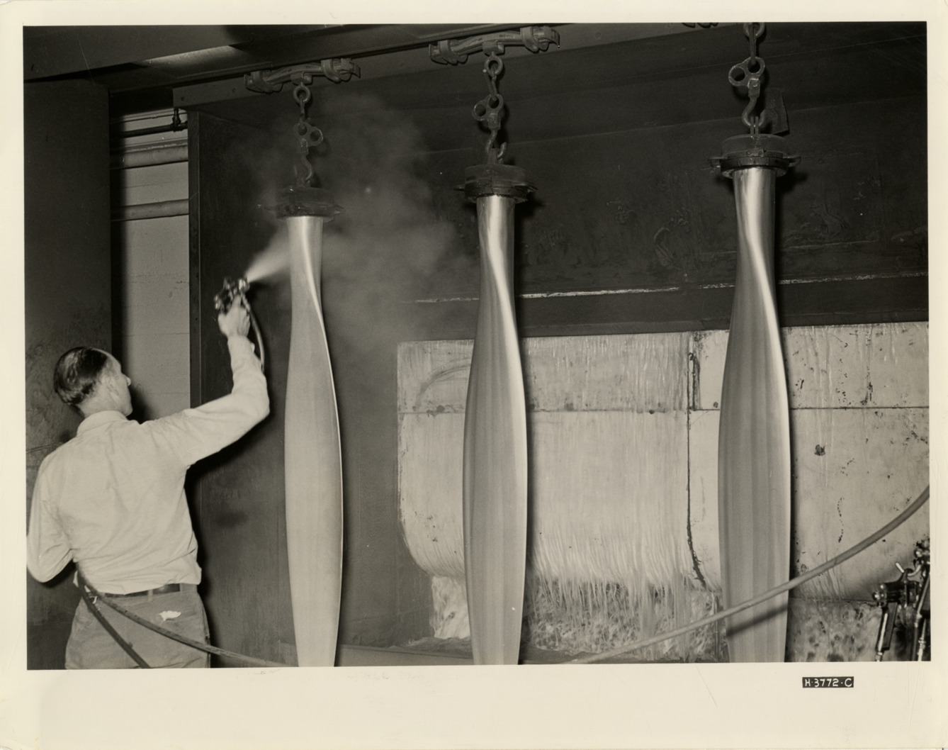 View of worker spray painting propellers for bombers at the Nash-Kelvinator Corporation in Detroit. Label on back: "Aircraft workers are more weight conscious than a debutante, for weight robs planes of performance and bomb-carrying capacity. As a result, these bombing plane propeller blades get coats of paint as thin as the sugar icing on today's cakes. A primary coat, a midnight black finish, and a yellow tip are sprayed on under pressure to form a protecting, non-reflecting covering which weights only a few ounces. Powerful suction ducts draw excess spray away from the operator and into the man-made waterfall in the background at this Nash-Kelvinator war plant. Infra-red lamps, like those used in automobile body plants, are then employed to dry the paint in five minutes, as compared to the six hours it formerly took to do the job. Press Bureau, Nash-Kelvinator Corporation, Detroit, July 20, 1942." Handwritten on back: "Aircraft propellers."