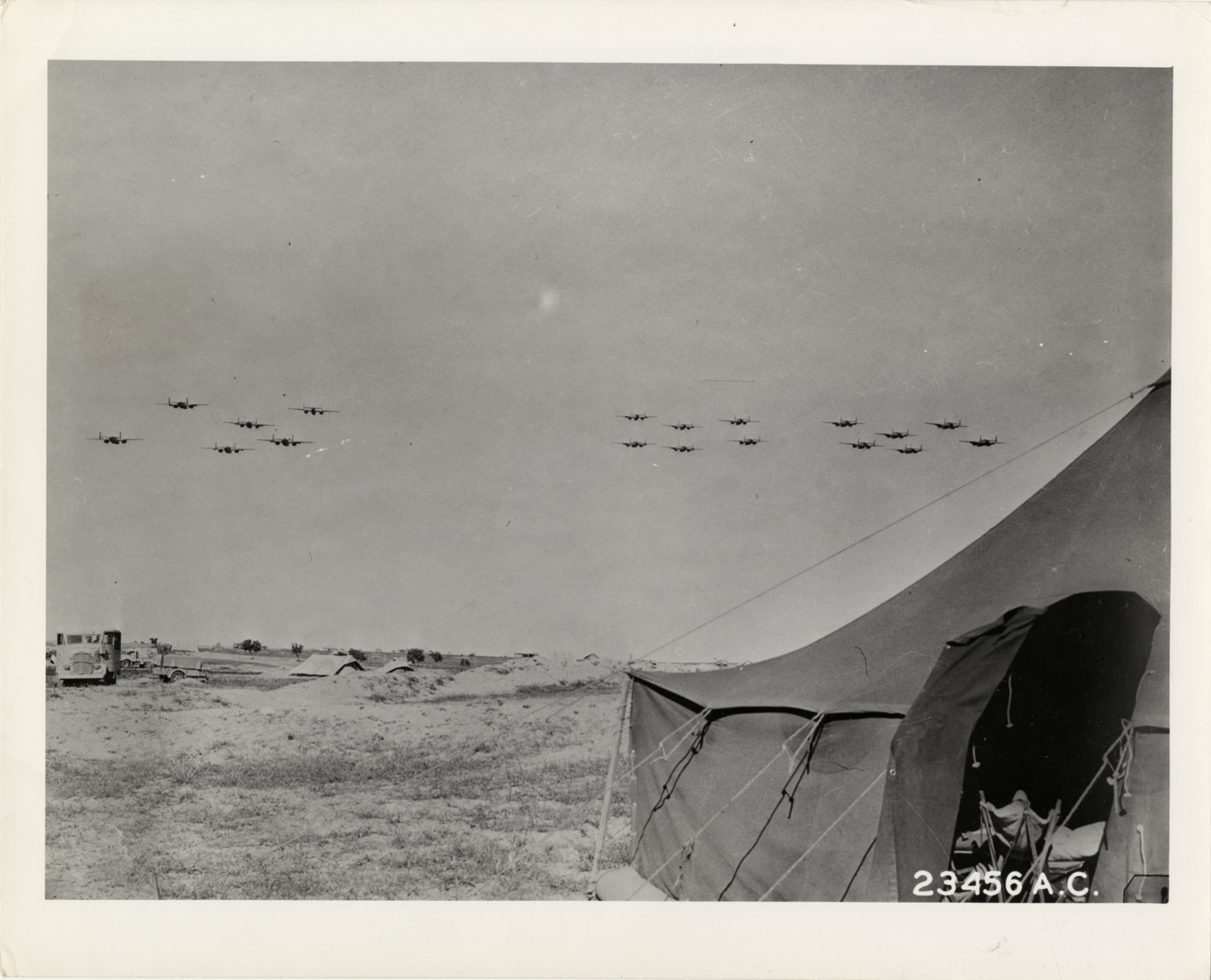 Distant view of Mitchell B-25 bombers on a mission in North Africa during World War II. Tent in foreground, trucks in background. Stamped on back: "Official photograph, U.S. Army Air Forces." Handwritten on back: "B-25's off on bombing mission, N. Africa. Aircraft in action."