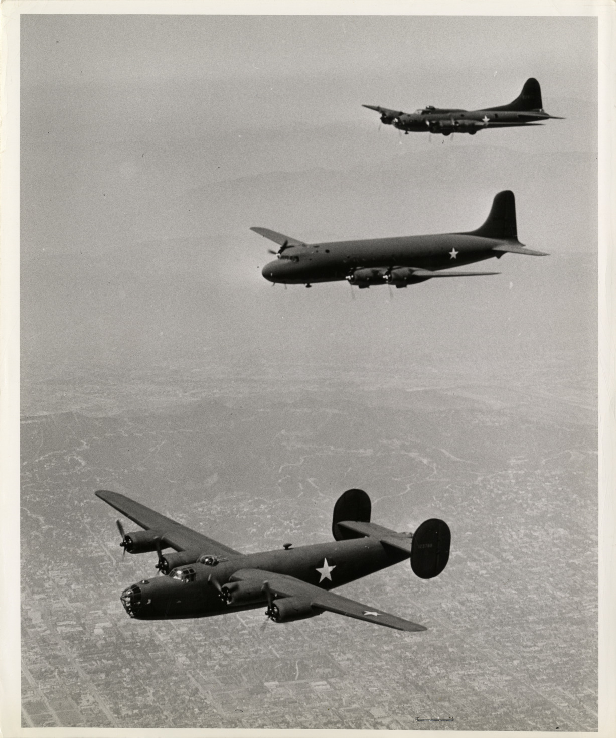 View of Boeing B-24 Liberator bomber, Douglas C-54 Skymaster transport plane and Boeing B-17 Flying Fortress bomber in formation. Label on back: "America's titans of the sky. Joined in formation for the first aerial photograph of its kind, the United States Army's three types of four-engine, long-range airplanes. Shown in center is the big C-54 Skymaster combat transport. At its left, a Liberator bomber, and at right, a Flying Fortress bomber. All three are in quantity production at the great plants of Douglas Aircraft Company. These are the only four-engine military airplanes in large-scale manufacture anywhere in the world, with Douglas the only firm building all three types. Designed by Douglas, C-54s today are swiftly conveying men and materials to far-flung battlefronts. Designed by Consolidated and Boeing respectively, the Liberator and Flying Fortress bombers daily win new laurels in their high-altitude precision blows against enemy ships and bases. Photo by Industrial and Public Relations Division. Douglas Aircraft Company, Inc." Stamped on back: "'Wings for victory' by Douglas. This photograph is released for your use by the Industrial and Public Relations Division, Douglas Aircraft Company, Inc." Handwritten on back: "Aircraft in action."