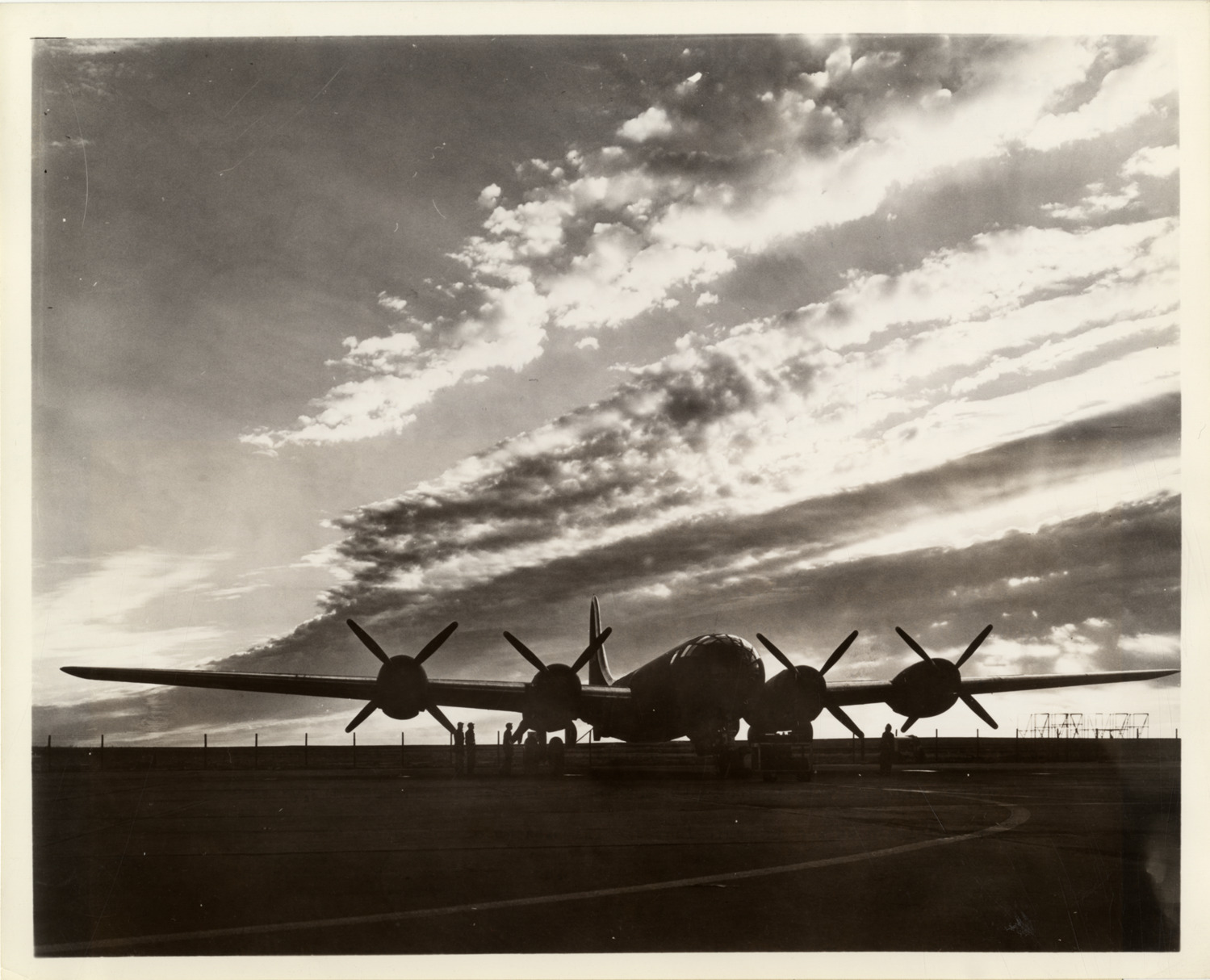 View of Boeing B-29 Superfortress bomber in flight. Label on back: "Superfortress greets the dawn. Poised for flight as dawn breaks, the Boeing B-29 Superfortress is given a final engine check before the four Wright Cyclone '18' engines lift the mighty monster into the air. Silhouetted here against the morning sky, the wing, spanning more than 141 feet, embodies a completely new design, believed to be the most efficient ever devised. Designed and engineered by Boeing Aircraft Company, the Superfortress is being produced by Boeing's three plants and by three other major manufacturers. All external armament has been deleted from the picture for security reasons. Cleared by War Department. From: Boeing News Bureau, Seattle, Wichita." Stamped on back: "Courtesy of News Bureau, Boeing Aircraft Company, Seattle, Washington. Designers and builders of the B-29 Superfortress, B-17 Flying Fortress, Stratoliner, Clipper." Handwritten on back: "Aircraft in action."