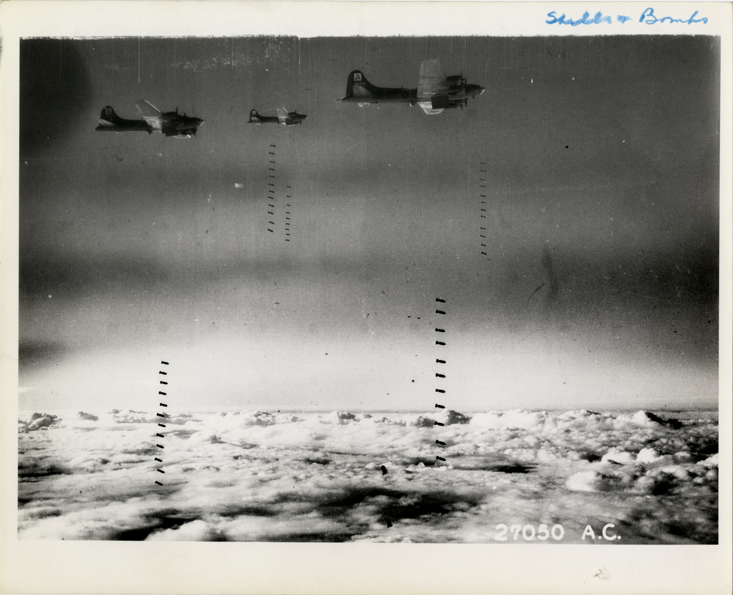 View of Boeing B-17 Flying Fortress bombers during an attack over Emden, Germany during World War II. Stamped on back: "Released for publication. Credit: Official photo U.S. Air Forces." Handwritten on back: "Boeing B-17 Forts during an attack on the part of Emden, 2 Oct 43. Aircraft in action."