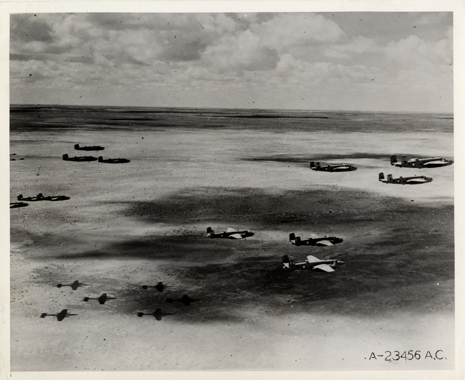 View of Mitchell B-25 bombers on a mission in North Africa during World War II. Label on back: "AC 23456. Streaking toward their target, German-held territory in Tunisia, these American B-25 bombers cast their shadows on bleak African desert country once held by Rommel." Stamped on back: "Official photograph, U.S. Army Air Forces." Handwritten on back: "Aircraft in action."