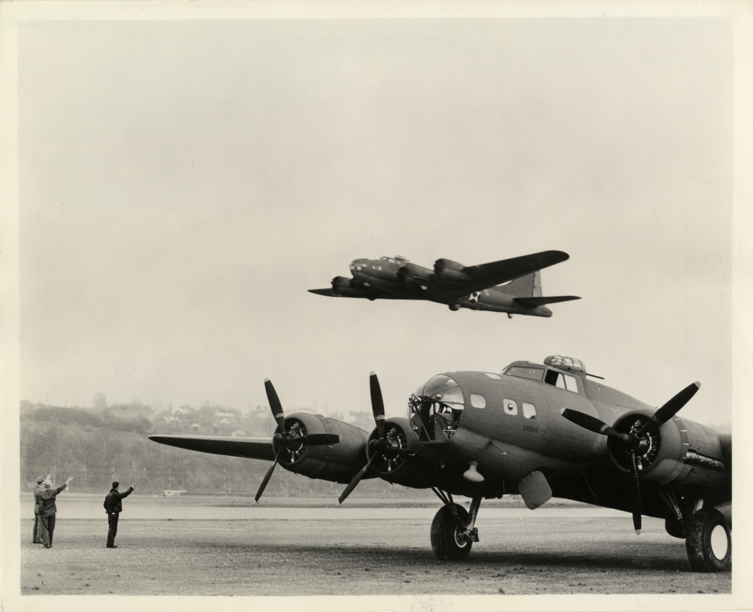 View of two Boeing B-17 Flying Fortress bombers. Three men stand on runway. Label on back: "A familiar sight at the Boeing Aircraft Co. in Seattle as a new Boeing B-17E Flying Fortress roars overhead on a delivery flight to an Air Forces base. The other Fortress in the foreground awaits a final check flight. Powered by four turbo-supercharged Wright engines, the B-17E boasts many refinements over earlier Flying Fortresses." Handwritten on back: " Aircraft in action."
