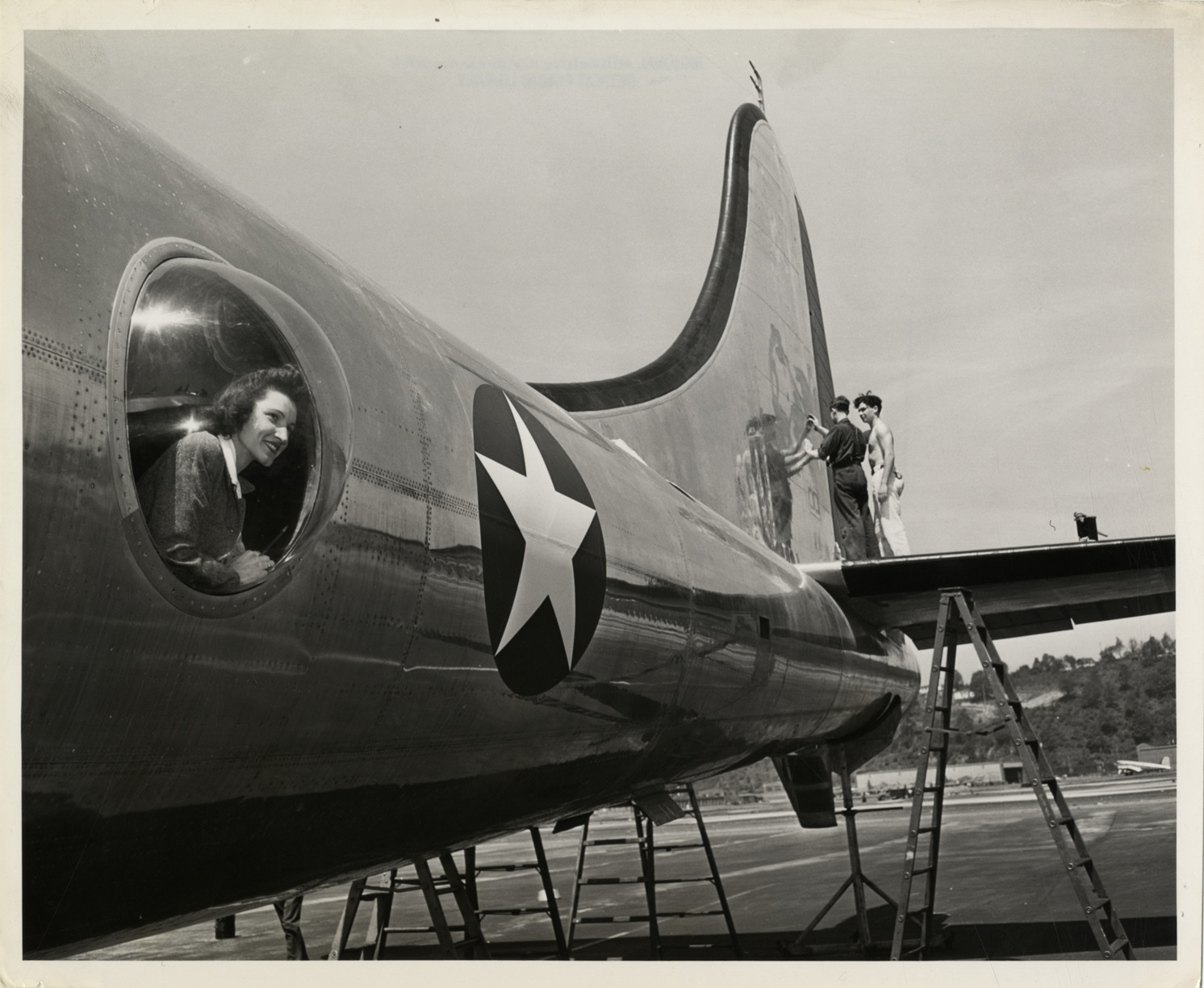 View of Boeing B-29 Superfortress bomber. Woman poses in gunner's sighting position; two men stand on wing. Label on back: "Sighting station. Visibility is the word for the gunners' posts of duty on the Boeing B-29 Superfortress. Here an attractive girl employee at the Boeing factory, poses in one of the gunner's sighting positions in America's newest heavy bomber. Aerodynamic cleanness of the Superfortress is readily seen in this picture. External armament details are not shown here, for security reasons. Cleared by War Department. From: Boeing News Bureau, Seattle, Wichita." Stamped on back: "Courtesy of News Bureau, Boeing Aircraft Company, Seattle, Washington. Designers and builders of the B-29 Superfortress, B-17 Flying Fortress, Stratoliner, Clipper." Handwritten on back: "Aircraft in action."