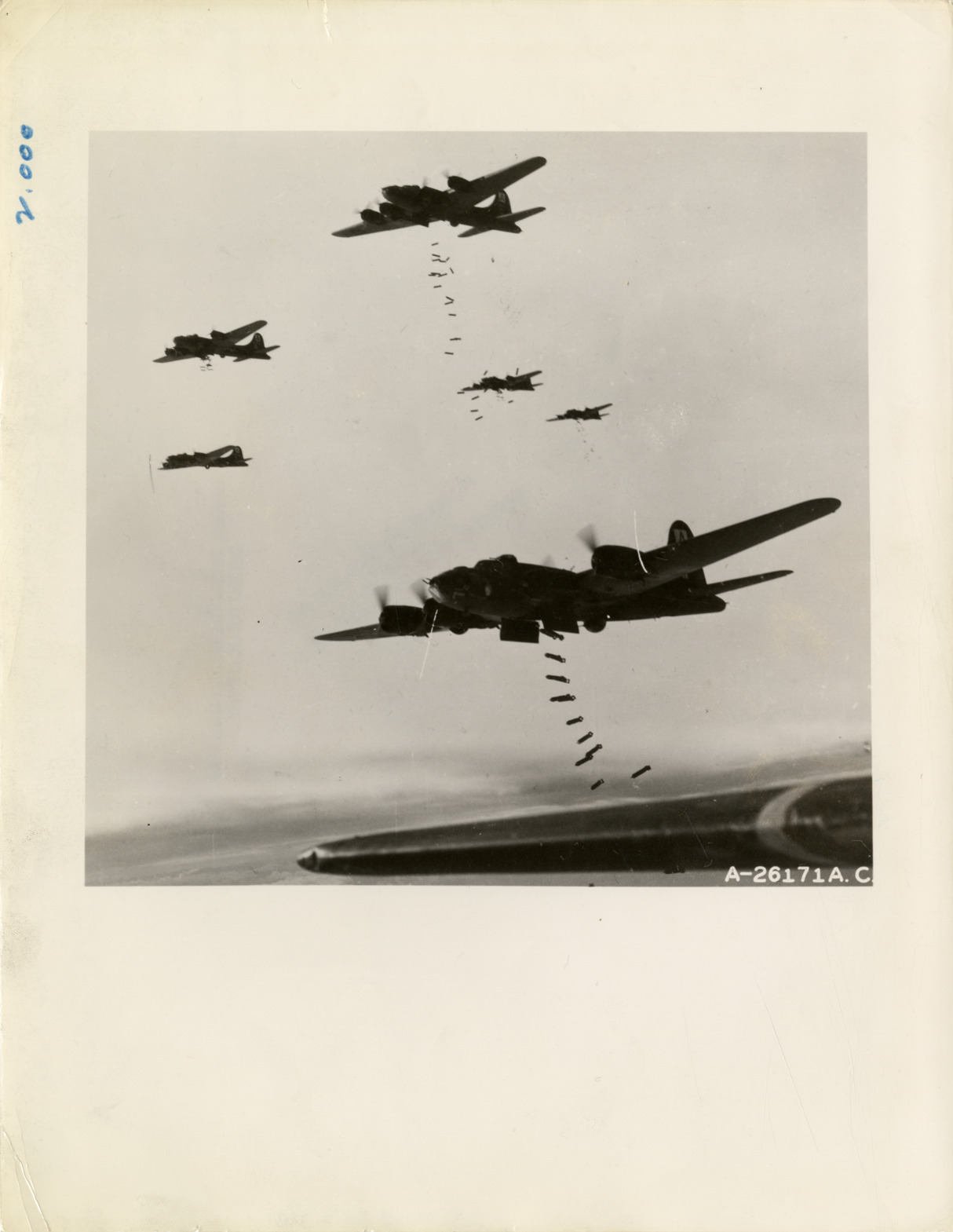 View of Boeing B-17 Flying Fortress bomber dropping bombs over Munster, Germany during World War II. Stamped on back: "Released for publication. Credit: Official photograph, U.S. Army Air Forces." Handwritten on back: "Flak from German anti-aircraft guns did not direct the Flying Forts from their target of the day--Munster, Germany. Aircraft in action."