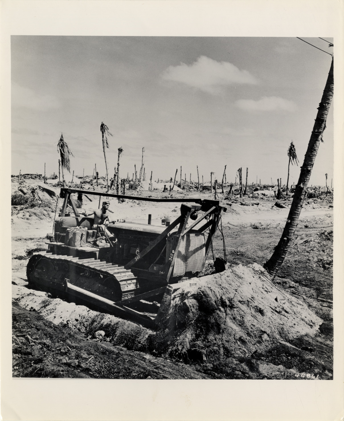 View of man operating Caterpillar D8 diesel tractor with bulldozer clearing sand and vegetation for military base on Kwajalein Island in the Marshall Islands during World War II. Label on back: "Caterpillar Tractor Co., Peoria, Il. Rec'd from Navy Department. Their letter, 7-13-44. Model, D8. Description of work, After the battle of Namur on Swajalein in the Marshall Island, 'Caterpillar' diesel tractors with bulldozers and scrapers operated by Navy Seabees begin the task of converting this island into a useful and indispensable advance base for our armed forces. Official U.S. Navy photo." Handwritten on back: "Bulldozers."