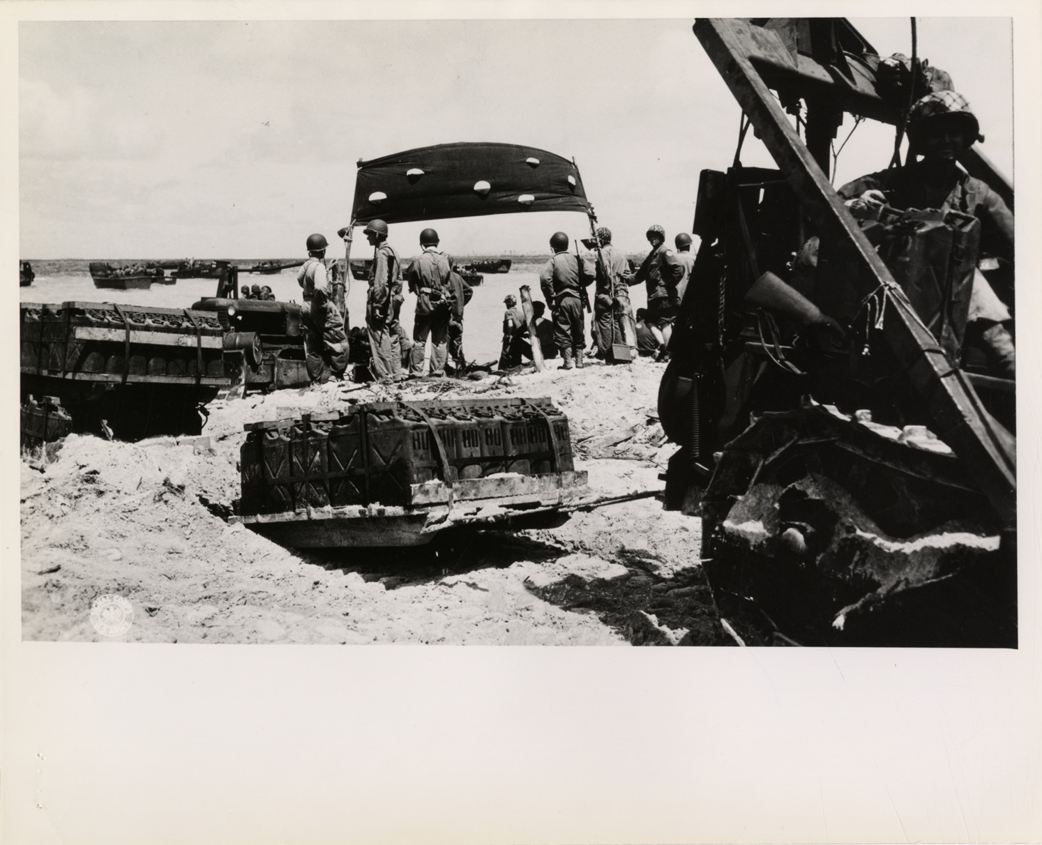 View of Caterpillar diesel D4 tractor towing three sleds of fuel during World War II. Soldiers in background. Stamped on back: "Signal Corps photo. Please credit. Released for publication by Bureau of Public Relations, War Department." Label on back: "Up the beach a D-4 tractor tows three sleds of fuel. Sleds are tandem-towed, with the third sled sitting on top of the second." Handwritten on back: "Bulldozers."