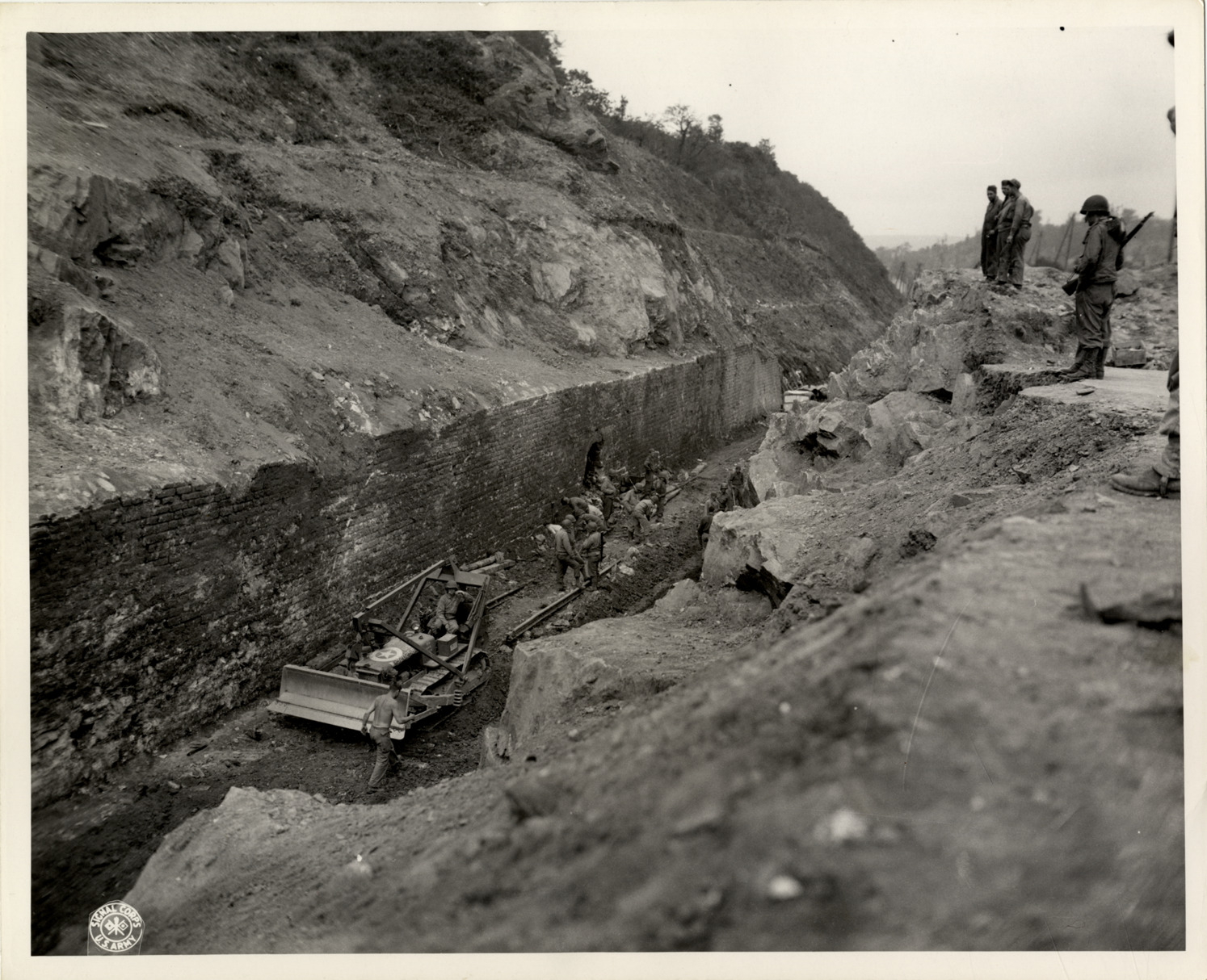 View of soldiers with bulldozer clearing debris from railroad tunnel at Cherbourg, France during World War II. Stamped on back: "Signal Corps photo. Please credit. Released by authority of the Bureau of Public Relations or by Theatre Press Censor." Label on back: "ETO Hq 44 x 6935, T 12 Feb 1945, 8939. Members of an engineer unit clear the debris away from what was formerly a tunnel leading to the Cherbourg railroad station. It was blasted by the retreating German forces." Handwritten on back: "Bulldozers."