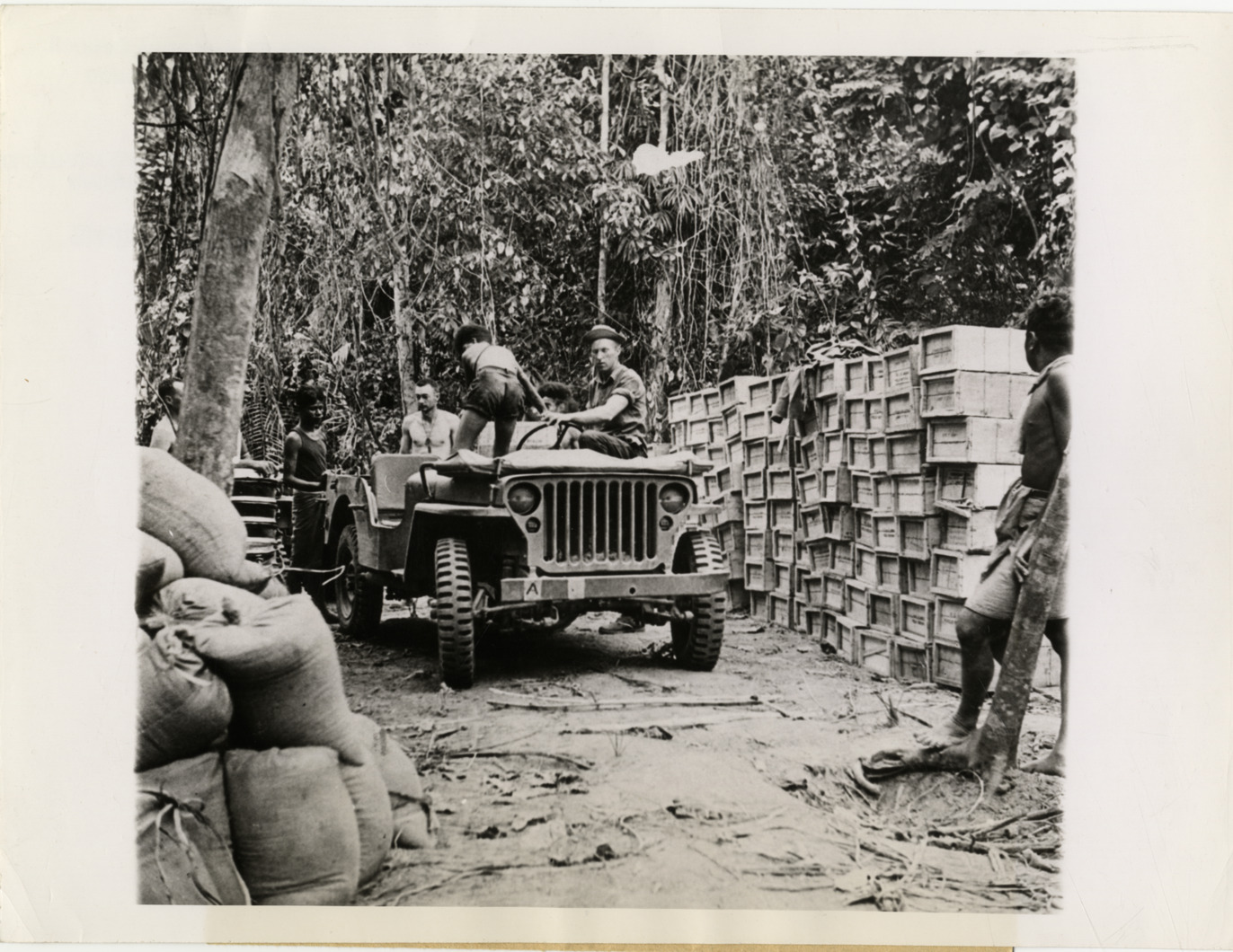 View of American soldiers with jeep in New Guinea during World War II. Burlap sacks in foreground; crates on right. Stamped on back: "Notice. This picture is the property of Press Association, Inc. and may be used only for the purposes of reproduction when authorized by the owner. It may not be syndicated, rented or loaned, or used for advertising purposes or for the purposes of trade. The following credit must be printed under each reproduction of this picture: Press Association, Inc." Label on back: "The end of a New Guinea trail. New Guinea. American soldiers reach their jungle destination and New Guinea natives unload their peeps which hurtled over trails cut through thick tropical growth. 11/13/42." Handwritten on back: "Jeeps."
