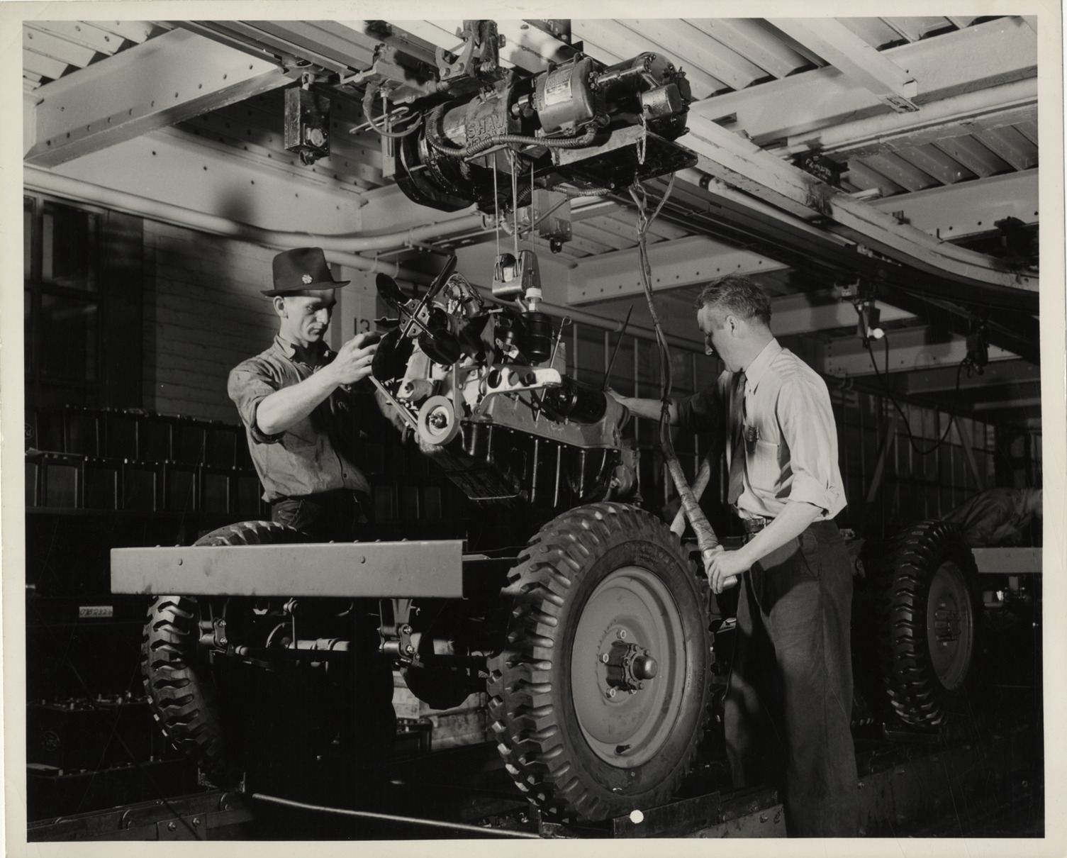 View of workers installing jeep motor at the Ford River Rouge Plant. Typed on back: "Blitz buggies. This motor has just come off the conveyor line, and is being placed in the chassis. Ford River Rouge Plant. May, 1941. OEM Defense photo by Palmer." Stamped on back: "The following credit line is requested: OEM Defense photo by Palmer." Handwritten on back: "Jeeps."