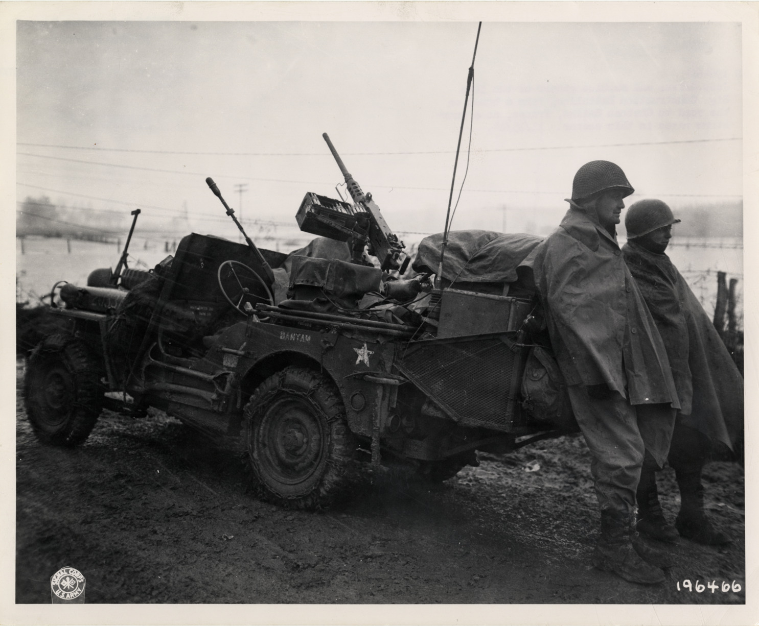 View of jeep driver and machine gunner resting against jeep on the road to Chateau Salins, France during World War II. Printed on front: "Signal Corps, U.S. Army." Label on back: "SC 196466. Jeep driver and machine gunner of the 34th Sig. Construction Battalion, take a break on the road to Chateau Salins, France, as a snowstorm rages in this sector. 11/15/44." Stamped on back: "Signal Corps photo, please credit. Released for publication by Bureau of Public Relations, War Department." Handwritten on back: "Jeeps."