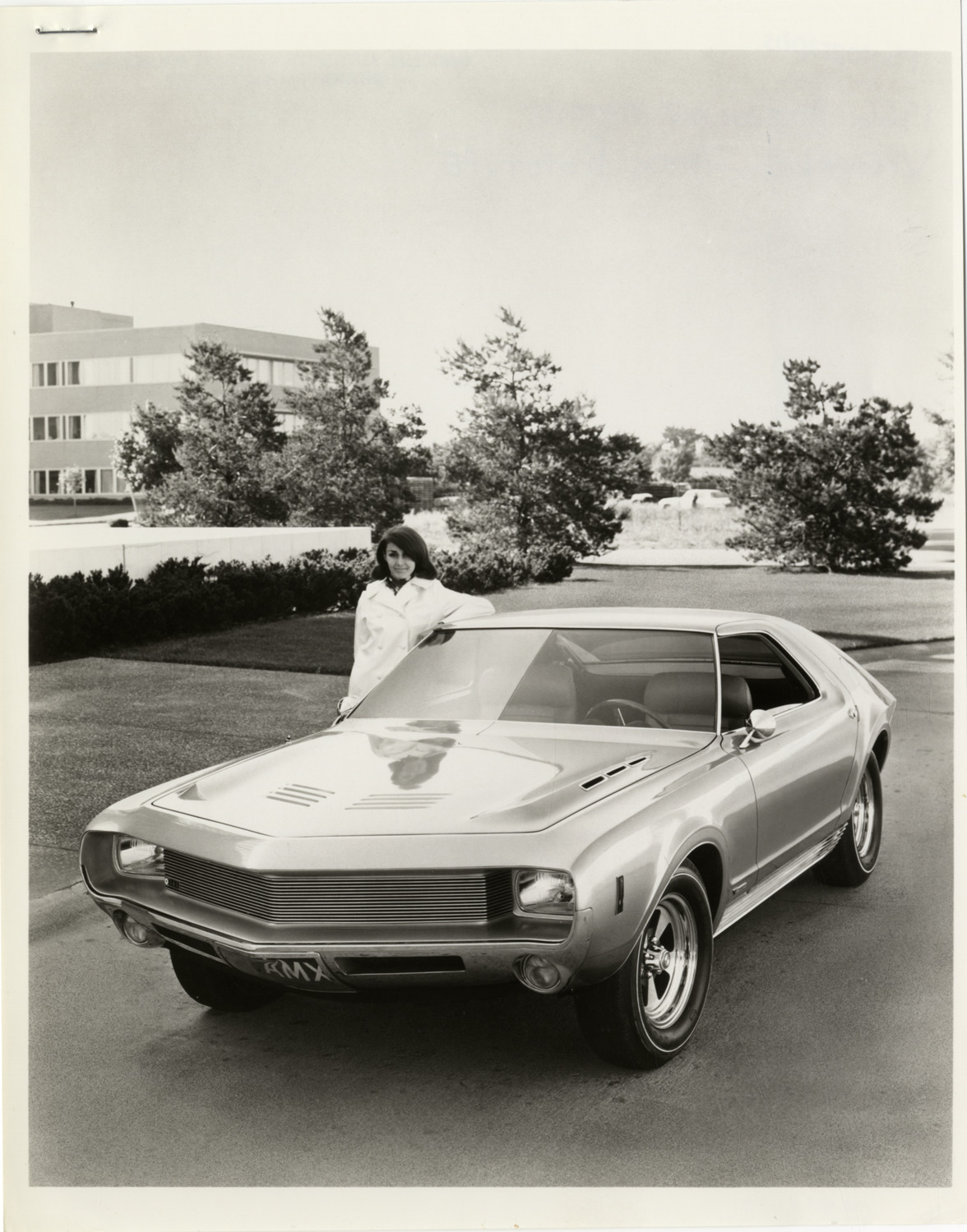 View of model posing with prototype for 1966 AMC AMX Vignale concept car. Label on back: "Public Relations Department, American Motors Corporation, 14250 Plymouth Road, Detroit, Michigan 48232. 17666. For P.M. release. Monday, June 20, 1966. A concealed roll-bar which is built into the cantilever roof and a 'Ramble seat' are among the unique features of the AMX, an experimental American Motors car. Powered by an all-new 290-cubic inch V-8, the AMX features three-way seating -- including full bucket front seats which flank the aircraft type console, fold-down, contoured rear seats, and the 'Ramble seat.' The sporty flashback has a wheelbase of 98 inches, 179 inches long, and is 48 inches high." Handwritten on back: "1966 American Motors Vignale, AMX prototype."