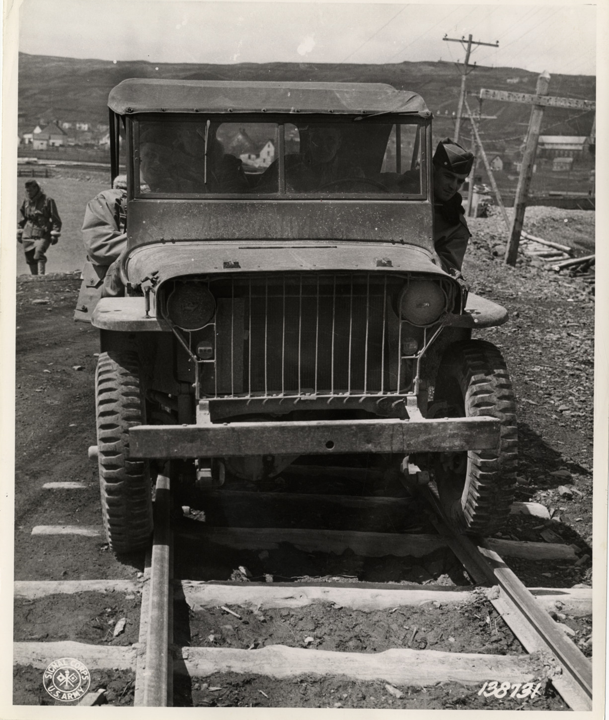 View of war photographer and soldiers in jeep on railroad tracks in Newfoundland during World War II. Printed on front: "Signal Corps, U.S. Army." Label on back: "138731. A War Department photographer accompanied troops in a small convoy on a ten day reconnaissance trip in Newfoundland, June 1942. A jeep in the convoy takes to the railway ties as the 'back roads' in this rugged country became impassable." Stamped on back: "Watch your credit. No objection to reproducing or publishing this picture provided credit line 'Photo by U.S. Army Signal Corps' appears on the photograph or page except that written permission must be obtained from the War Department if it is desired for use in commercial advertising. Signal Corps Photographic Laboratory, Wash., D.C." Handwritten on back: "Jeeps."