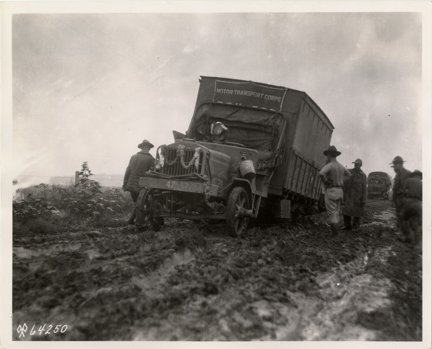 View of a Standard B Liberty truck on a muddy road during the 1919 Motor Transport Corps transcontinental convoy. Men stand in road around truck. Label on back: "Motor Transport Corps, Transcontinental Tour, 1919. 3 to 5 ton Standard B, 2d series ('USA' or 'Liberty' truck)." Stamped on back: "No objection to reproducing or publishing this picture provided credit line 'Photo by U.S. Army Signal Corps' appears on the photograph or page, except that permission must be obtained from the War Department if it is desired for use in commercial advertising." Handwritten on back: "Historical motor vehicles."