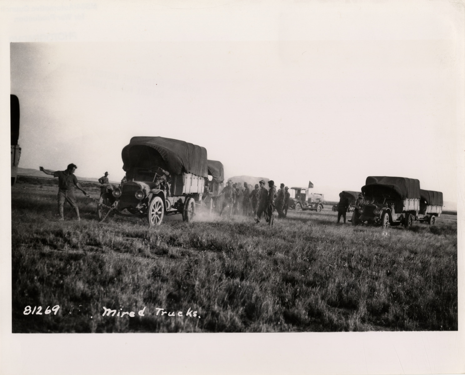 View of several White trucks mired in mud during the Mexican Punitive Expedition. Printed on front: "Mired trucks." Label on back: "81269. Mexican Punitive Expedition. Mired trucks near Big Bend district. 1-1/2 T. 4 x 2 Whites, Mexico, 1916-17." Stamped on back: "No objection to reproducing or publishing this picture provided credit line 'Photo by U.S. Army Signal Corps' appears on the photograph or page, except that permission must be obtained from the War Department if it is desired for use in commercial advertising." Handwritten on back: "Historical motor vehicles."
