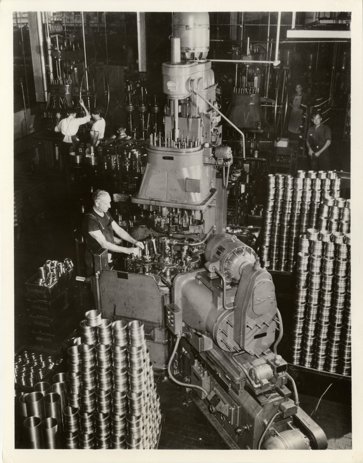 Workers operating multiple drill, General Motors, Rochester Products Division plant