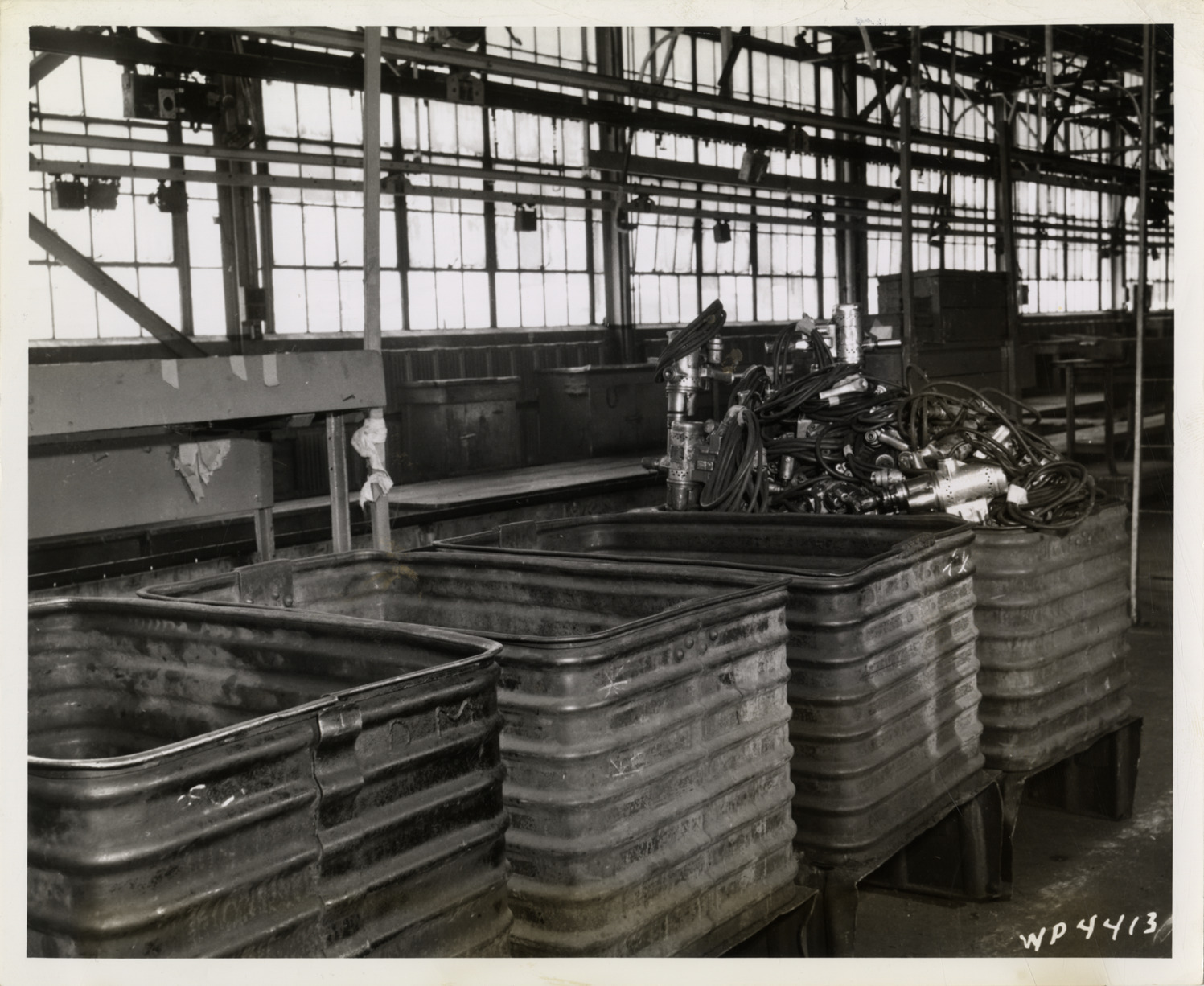 View of assembly line hand tools in bins at Chrysler Corporation, Plymouth Division plant in Detroit, Michigan. Label on back: "A week ago the automobile industry's most complete assembly line, now empty and silent. One week ago Plymouth cars rolled off this line and now wreckers are dismantling domestic production machinery to make way for war production. WP-4413." Handwritten on back: "Conversion."