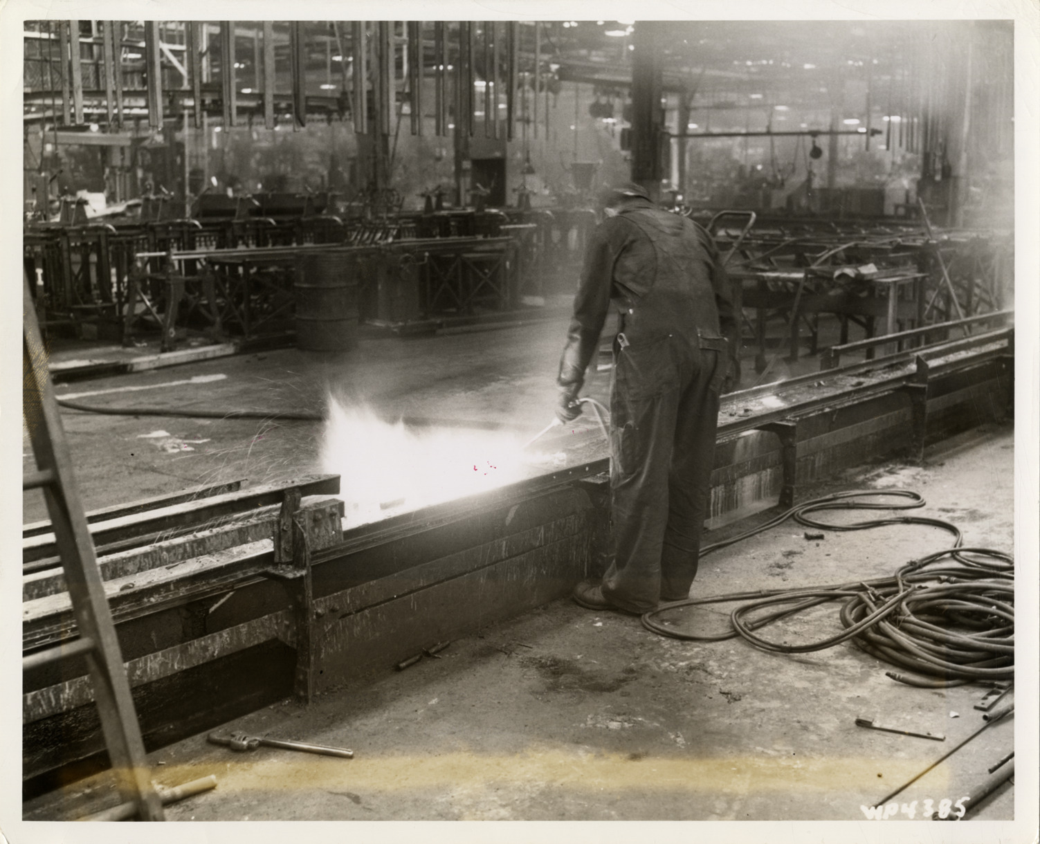 View of worker tearing down motor production assembly lines with an acetylene torch at Chrysler Corporation, Plymouth Division plant in Detroit, Michigan. Label on back: "Tearing down motor production assembly lines with acetylene torches at the Plymouth plant. WP-4385." Handwritten on back: "Conversion."