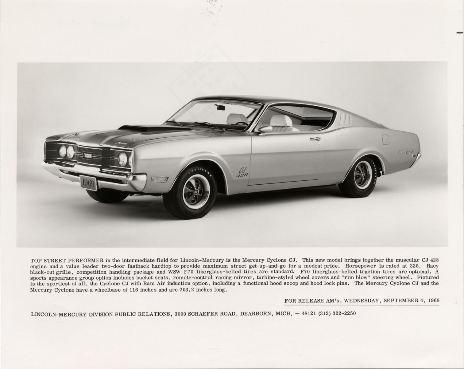 View of 1969 Mercury Cyclone CJ car. Printed on front: "Top street performer in the intermediate field for Lincoln-Mercury is the Mercury Cyclone CJ. This new model brings together the muscular CJ 428 engine and a value leader two-door fastback hardtop to provide maximum street get-up-and-go for a modest price. Horsepower is rated at 335. Racy black-out grille, competition handling package and WSW F70 fiberglass-belted tires are standard. F70 fiberglass-belted traction tires are optional. A sports appearance group option includes bucket seats, remote-control racing mirror, turbine-styled wheel covers and 'rim blow' steering wheel. Pictured is the sportiest of all, the Cyclone CJ with Ram Air induction option, including a functional hood scoop and hood lock pins. The Mercury Cyclone CJ and the Mercury Cyclone have a wheelbase of 116 inches and are 203.2 inches long. For release AM's, Wednesday, September 4, 1968. Lincoln-Mercury Division Public Relations, 3000 Schaefer Road, Dearborn, Mich., 48121 (313) 322-2250."