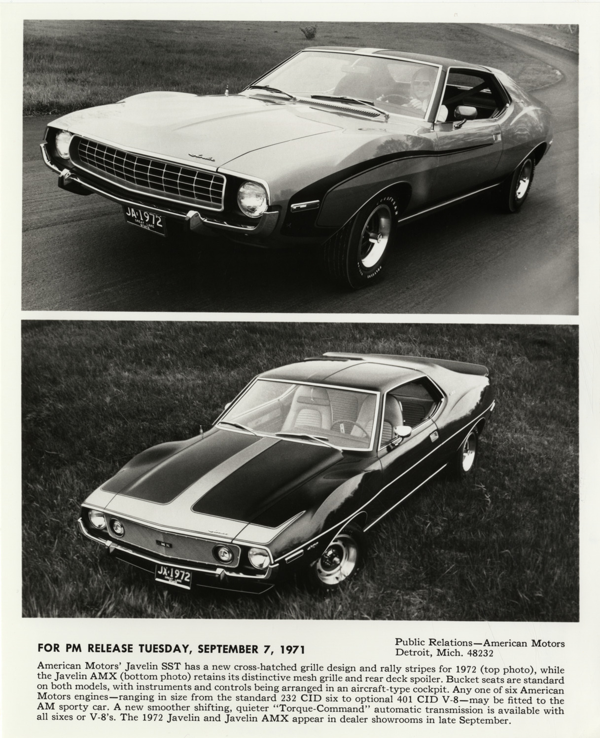 Two views of a 1972 AMC Javelin SST and a 1972 AMC Javelin AMX car. Printed on front: "For PM release Tuesday, September 7, 1971. Public Relations, American Motors, Detroit, Mich. 48232. American Motors' Javelin SST has a new cross-hatched grille design and rally stripes for 1972 (top photo), while the Javelin AMX (bottom photo) retains its distinctive mesh grille and rear deck spoiler. Bucket seats are standard on both models, with instruments and controls being arranged in an aircraft-type cockpit. Any one of six American Motors engines -- ranging in size from the standard 232 CID six to optional 401 CID V-8 -- may be fitted to the AM sporty car. A new smoother shifting, quieter 'Torque-Command' automatic transmission is available with all sixes or V-8's. The 1972 Javelin and Javelin AMX appear in dealer showrooms in late September."