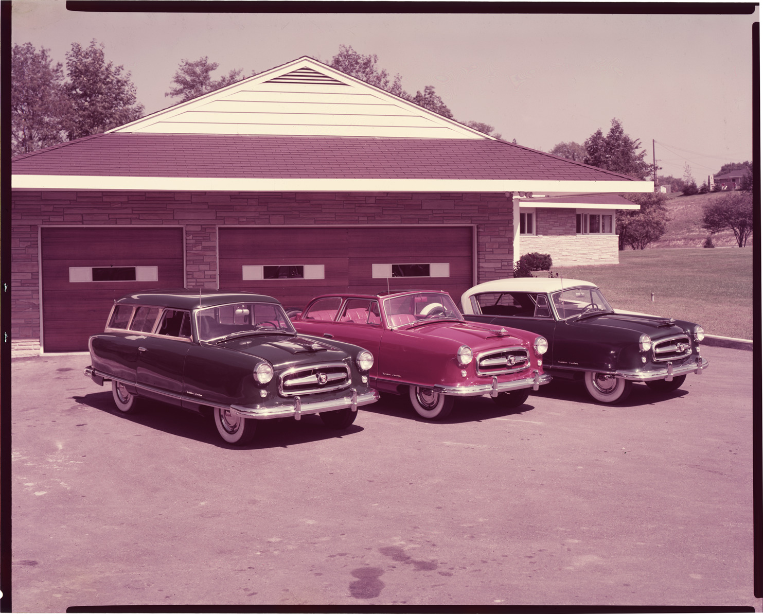 Favorite this☆ 1953-1954 Nash Rambler automobiles Description: View of 1953-1954 Nash Rambler sedan, convertible and station wagon, parked in front of garage. Label on sleeve: "AMC, Nash Rambler, 1953/54." Details Resource ID: na032733 Creator: Boulevard Photographic (Firm) Subject: Nash automobiles Station wagons Automobiles, Convertible Garages Advertising--Automobiles Transparencies Date Issued: 1953 to 1954 Format: 1 transparency : col. ; 8 x 10 in. Member of: National Automotive History Collection Mickey McGuire and Jim Northmore Boulevard Photographic Collection Filing Location: AMC, 1:1 Rights: Physical rights are retained by DPL. Copyright is retained in accordance with U.S. copyright laws.