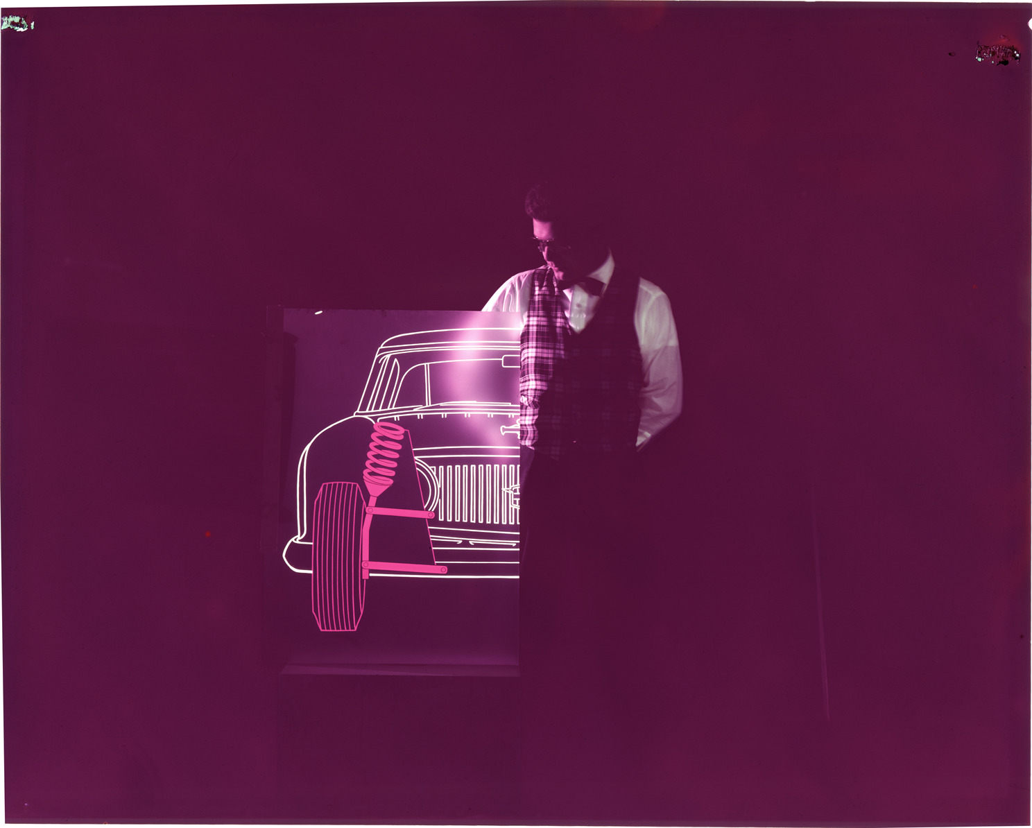 View of man posing with a drawing of the front end of a 1955 Nash car. Label on sleeve: "American Motors testing, Nash, 1955."