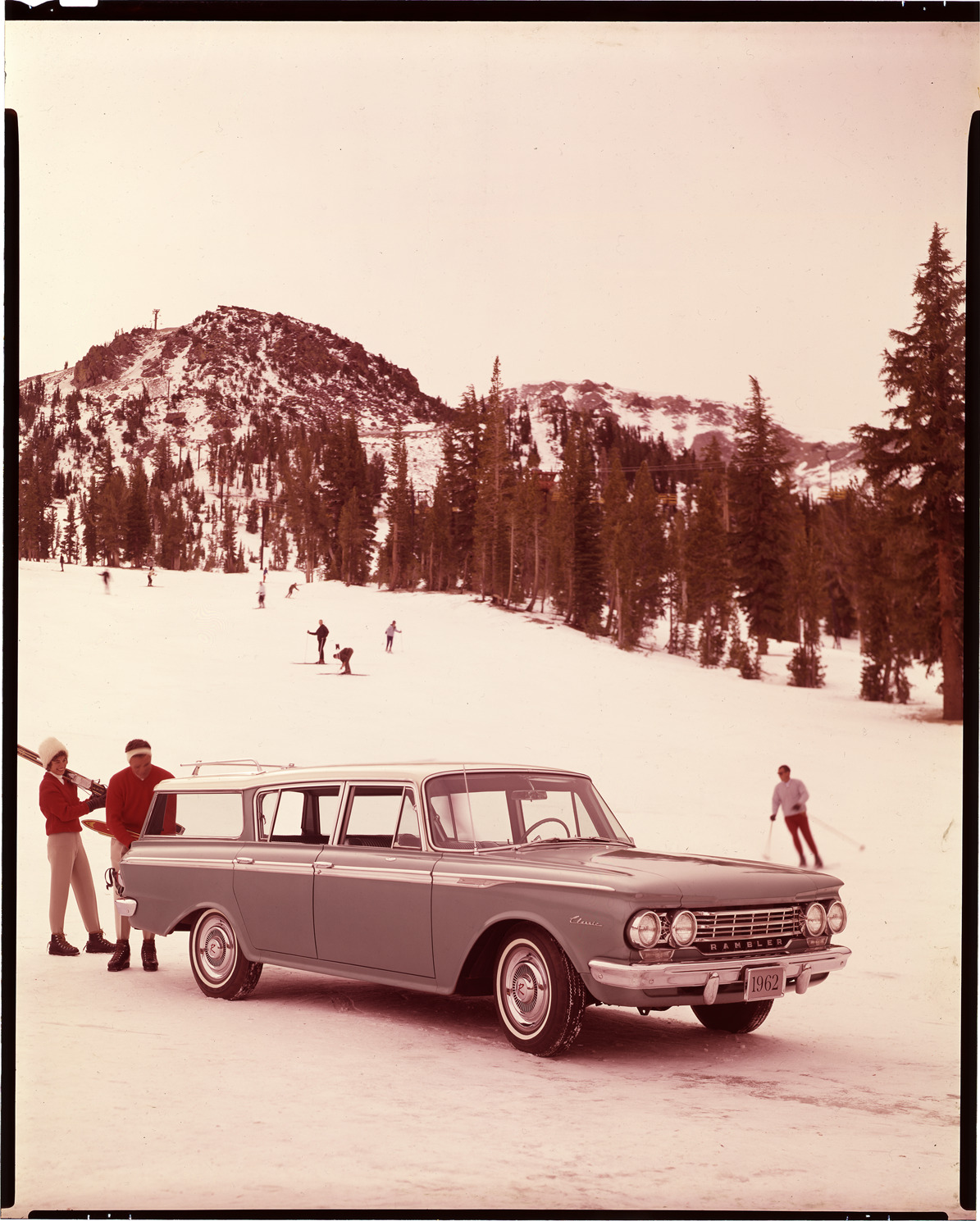 View of skiers with 1962 AMC Rambler Classic station wagon. Ski slopes in background. Label on sleeve: "AMC Rambler Classic wagon, 1962."