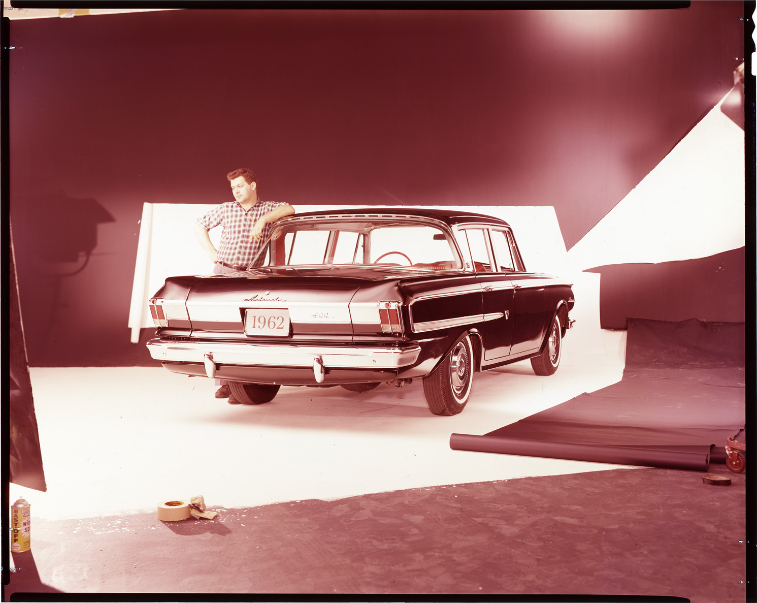 Favorite this☆ 1962 AMC Rambler Ambassador automobile Description: Rear view of man posing next to 1962 AMC Rambler Ambassador sedan in studio. Label on sleeve: "AMC Rambler Ambassador, 1962." Details Resource ID: na032791 Creator: Boulevard Photographic (Firm) Subject: Rambler automobile Ambassador automobile Advertising--Automobiles Transparencies Date Issued: 1962 Format: 1 transparency : col. ; 8 x 10 in. Member of: National Automotive History Collection Mickey McGuire and Jim Northmore Boulevard Photographic Collection Filing Location: AMC, 1:5 Rights: Physical rights are retained by DPL. Copyright is retained in accordance with U.S. copyright laws.