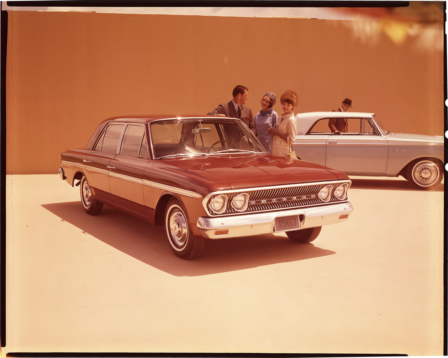 View of men and women with 1963 AMC Rambler sedan and coupe. Label on sleeve: "AMC Rambler models, 1963."
