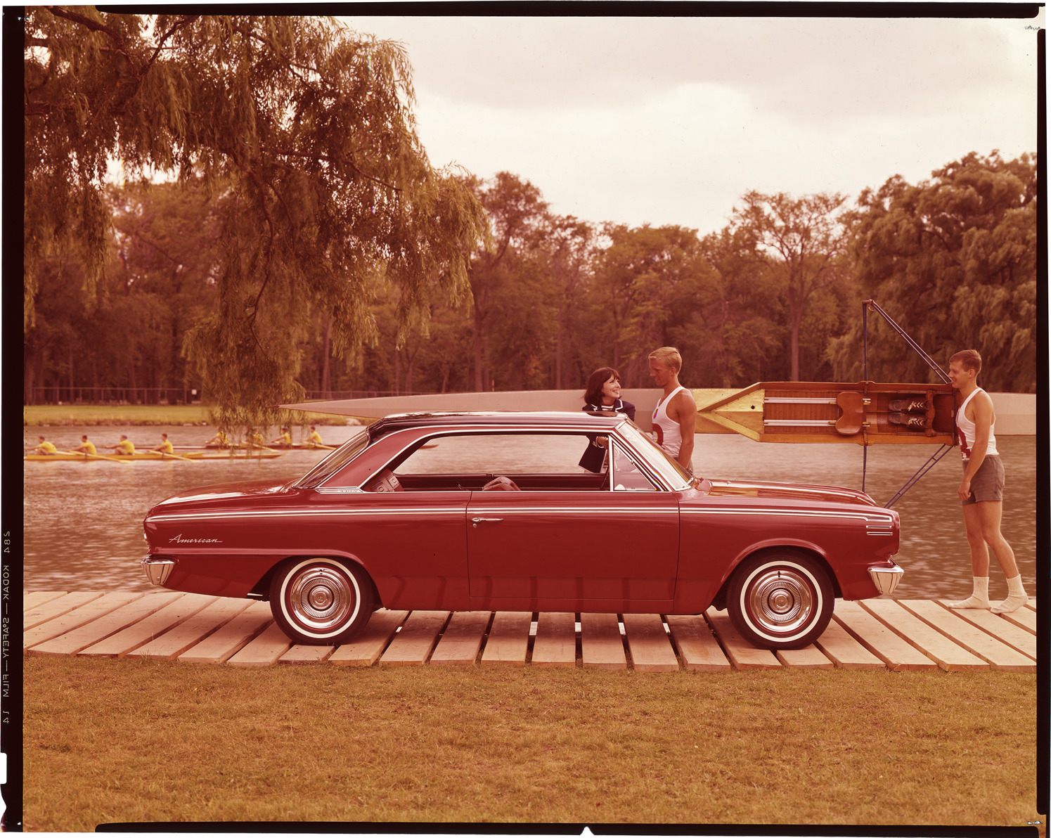 View of 1965 AMC Rambler Ambassador coupe parked on dock. Woman stands behind car, greeting two young men with racing shell. Rowers on river in background. Label on sleeve: "AMC, Rambler Ambassador, 1965."