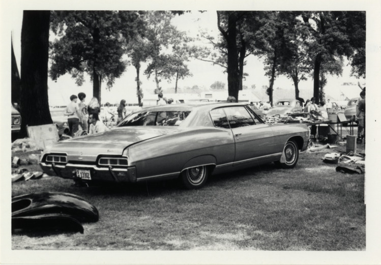 View of a 1967 Chevrolet Caprice Custom coupe, parked outdoors. Automobile parts displayed on ground; tables in background. Handwritten on back: "1967 Chev. Caprice Custom coupe."