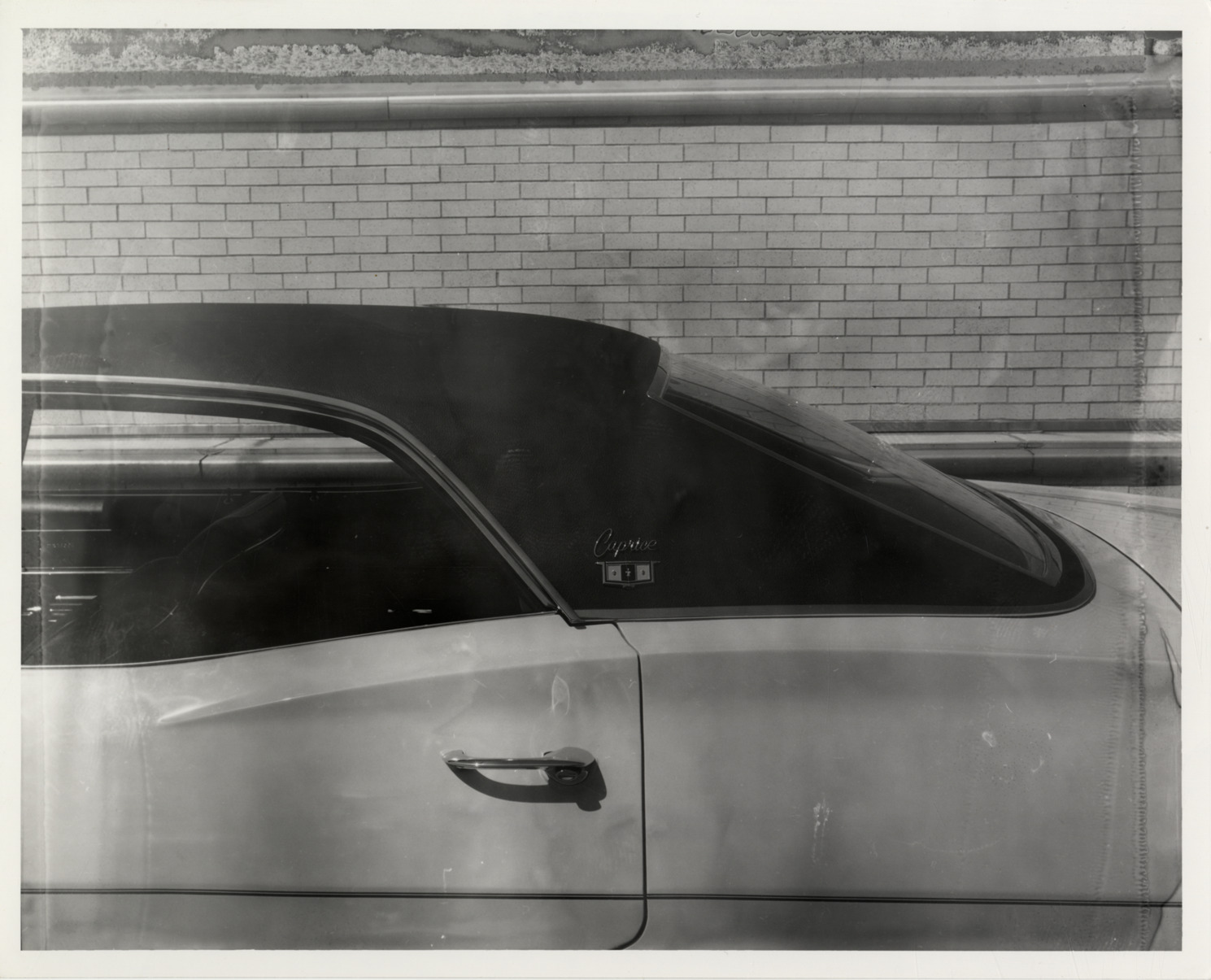 Close-up view of rear section of a 1967 Chevrolet Caprice Custom sedan, showing Caprice logo on roof. Stamped on back: "GM Photographic, 465 W. Milwaukee, Detroit, Mich. Please refer to this number when ordering prints." Typed on back: "Chevrolet, 1967. Model: Caprice Custom sedan."