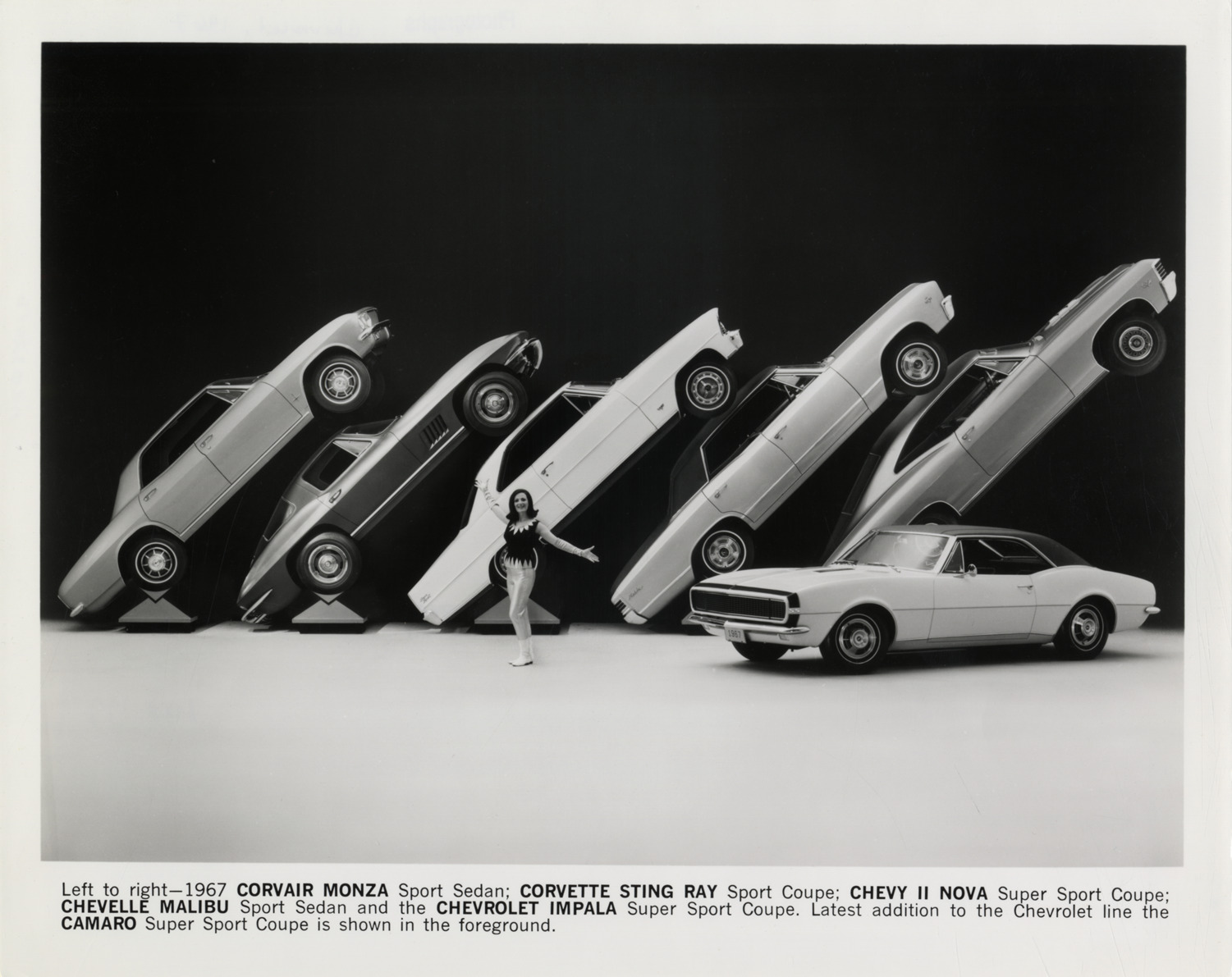 View of woman posing in front of display of 1967 Chevrolet cars. Printed on front: "Left to right, 1967 Corvair Monza Sport sedan; Corvette Sting Ray Sport coupe; Chevy II Nova Super Sport coupe; Chevelle Malibu Sport sedan and the Chevrolet Impala Super Sport coupe. Latest addition to the Chevrolet line the Camaro Super Sport coupe is shown in the foreground." Label on back: "Five 1967 Chevrolet models appear to be standing at attention as the Camaro, newest member of the family, makes its introductory bow to the public (foreground, Camaro Super Sport). While each Chevrolet model has distinctive styling motifs, the all new Camaro features a new approach to the 'long hood-short deck' design so successfully introduced to U.S. buyers by the Corvette. All Chevrolet-built passenger cars go on public display at dealers' September 29."
