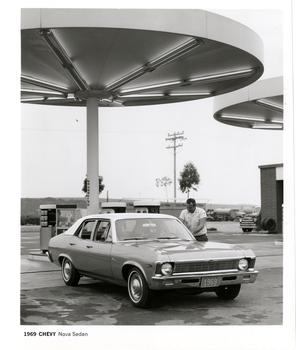 Favorite this☆ 1969 Chevrolet Nova automobile Description: View of man at gas station with a 1969 Chevrolet Nova sedan. Printed on front: "1969 Chevy Nova sedan." Details Resource ID: na032961 Subject: Nova automobile Service stations Photographic prints Date Issued: 1969 Format: 1 photographic print ; 9.75 x 7.75 in. Member of: National Automotive History Collection Filing Location: Chevrolet, 1969 Rights: Physical rights are retained by DPL. Copyright is retained in accordance with U.S. copyright laws.